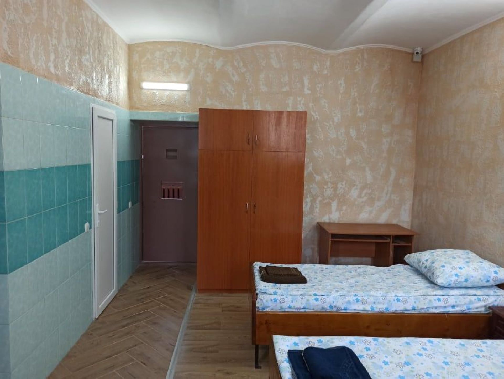 Ми побачили чоловічу та жіночу камери. Жінки, до слова, тут утримуються в окремому секторі, і можна відмітити, що їх камери виглядали досить охайно: на столику яблука, на полицях розставлені засоби гігієни. Є дзеркальце, спальні місця охайно встелені яскравими покривалами.