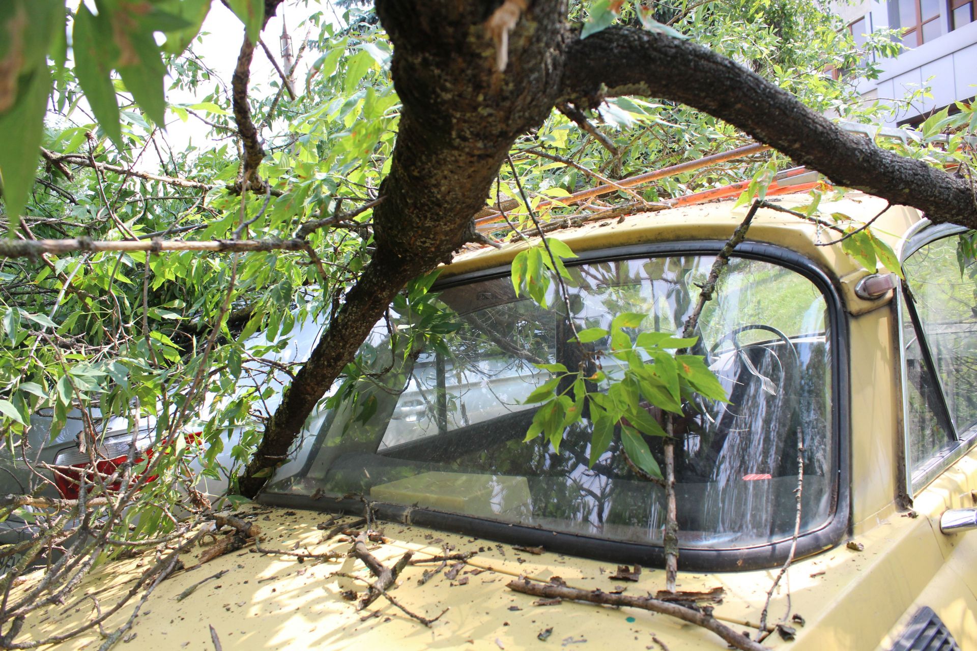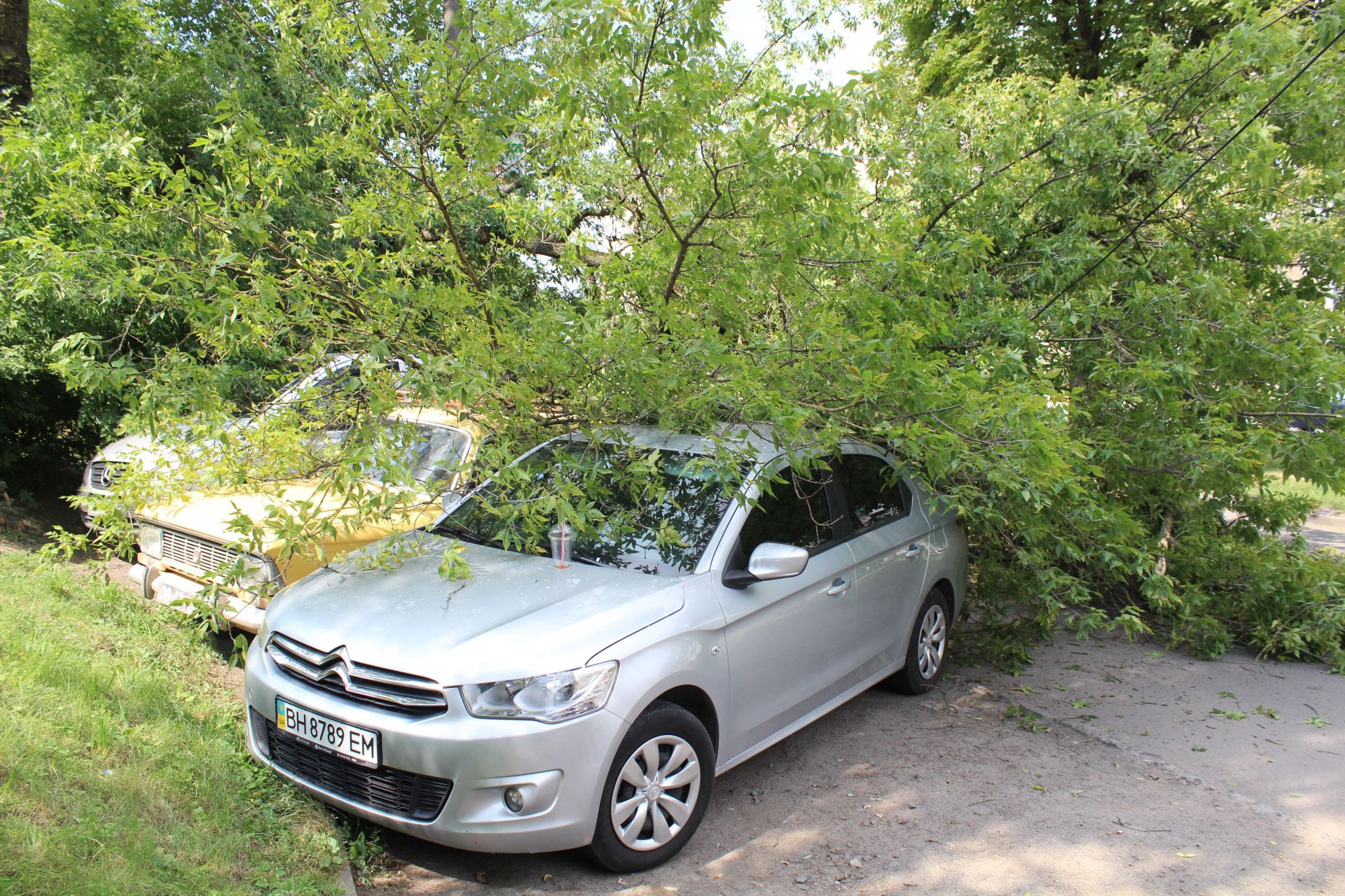 - Залишили авто на парковці, і пішли по справах. Почули звук, спустились, і дерево вже лежало на авто, - розповідає власниця Citroën Іванна. - Надіємось, що збитки відшкодують. Дерево впало через недбальство, хтось же мав знати, що воно в аварійному стані. Минулого року також дерево впало неподалік. Намагаємось додзвонитись і в міську раду, і в ЖКГ, і в ДСНС, але вже дві години ніхто не прибирає дерево.