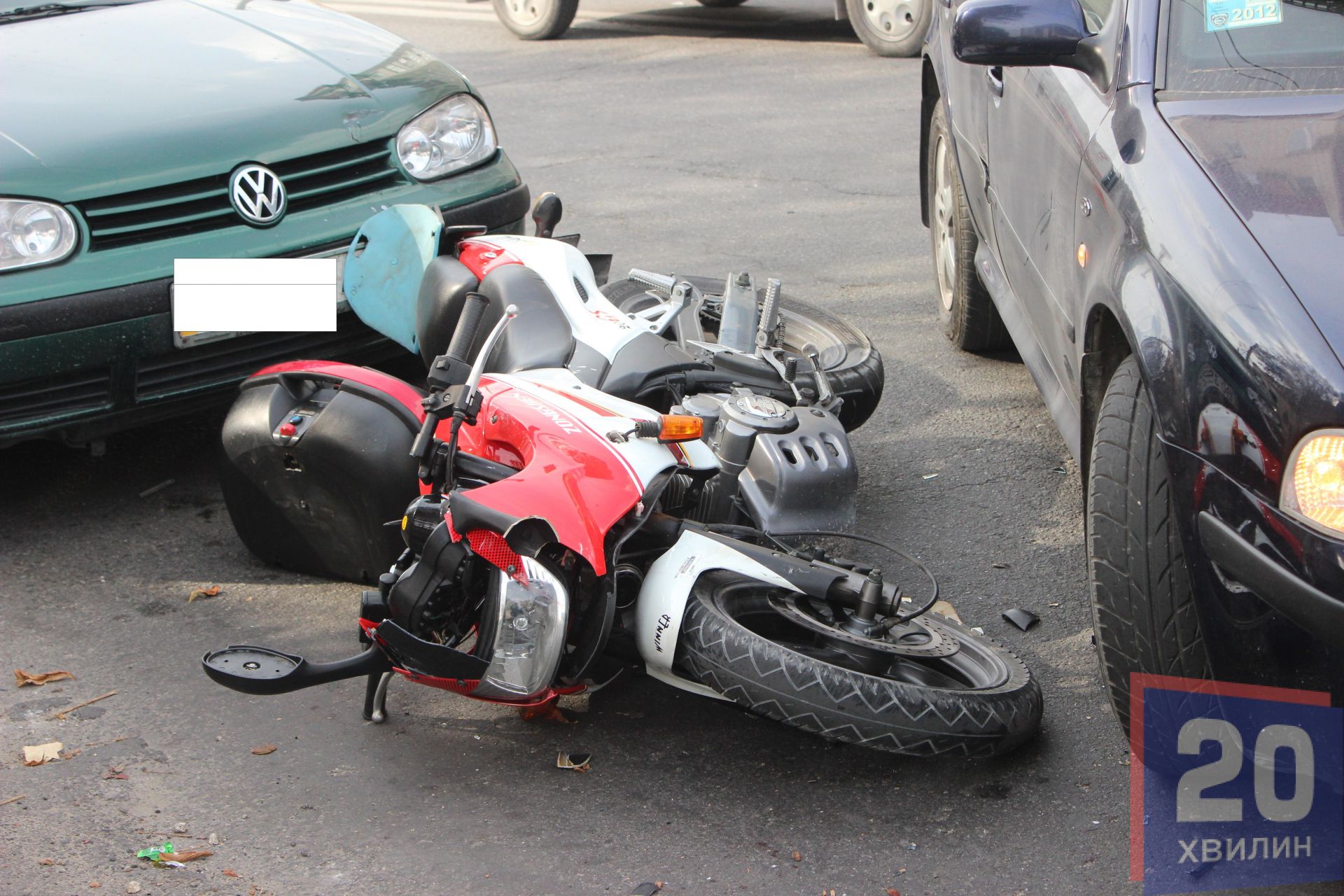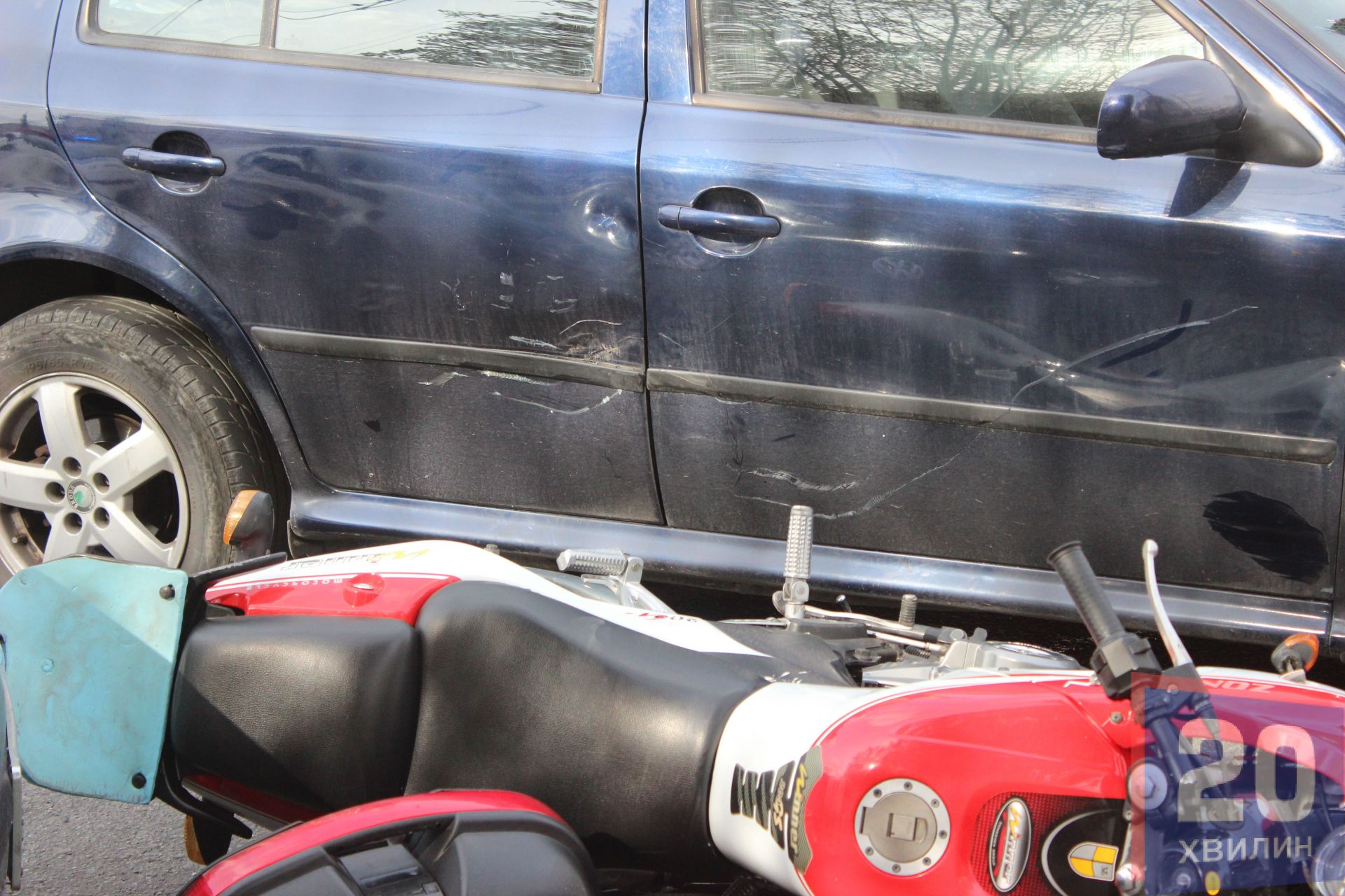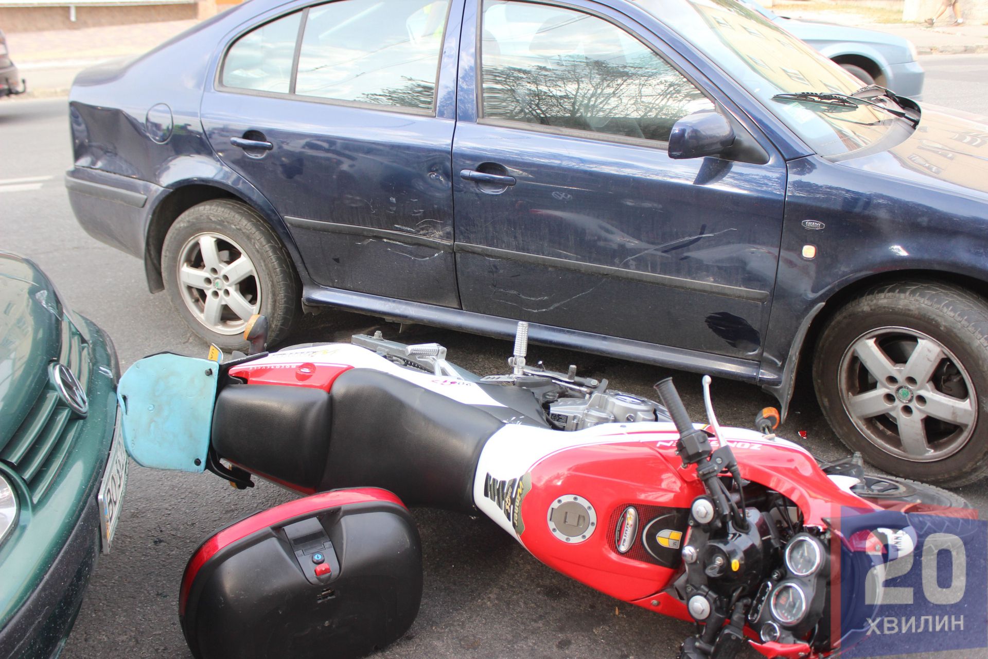 Зіткнулися Shcoda Octavia і мотоцикл Songshen200. Під час аварії пошкодили ще припаркований Volkswagen Golf.