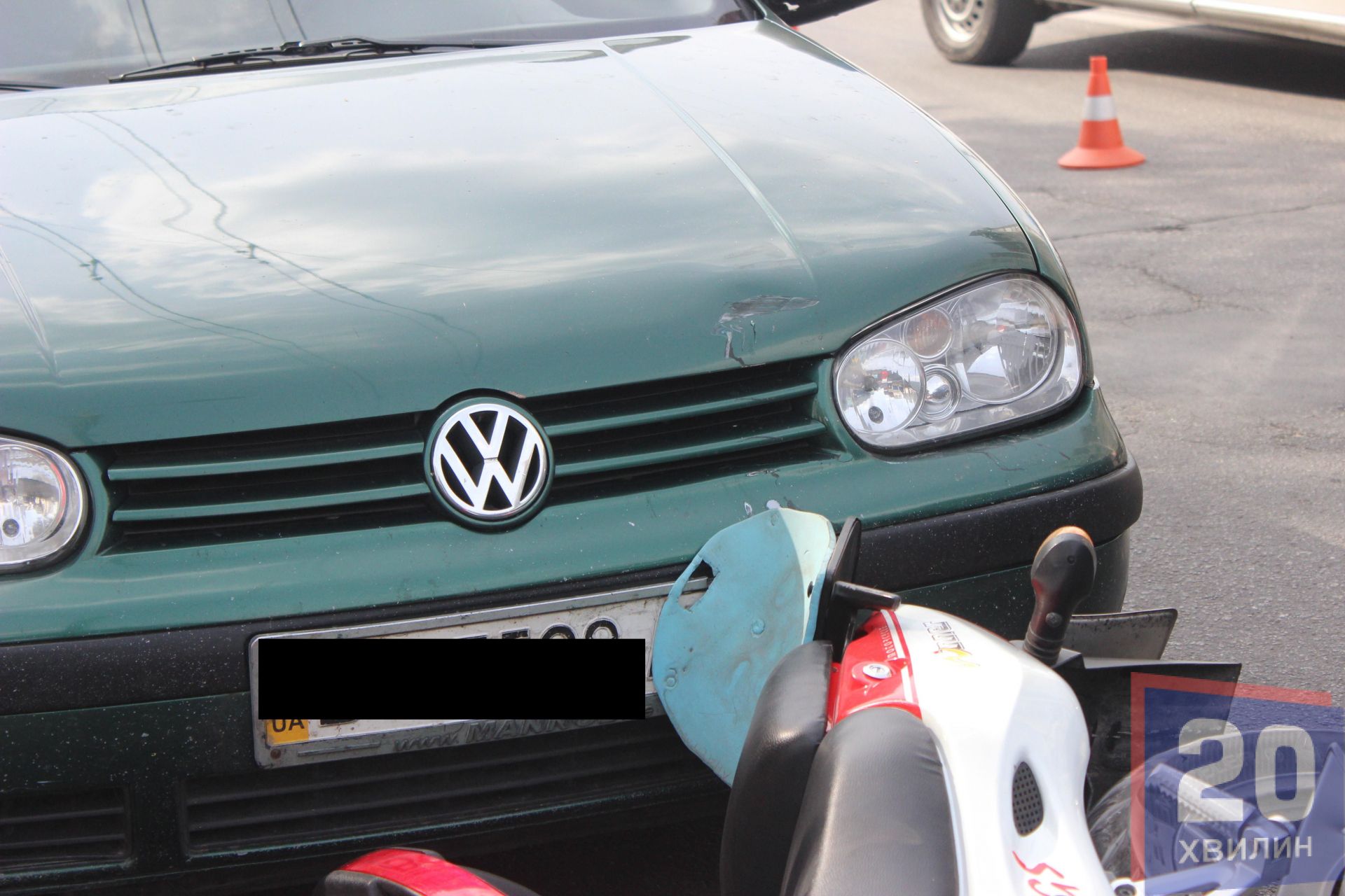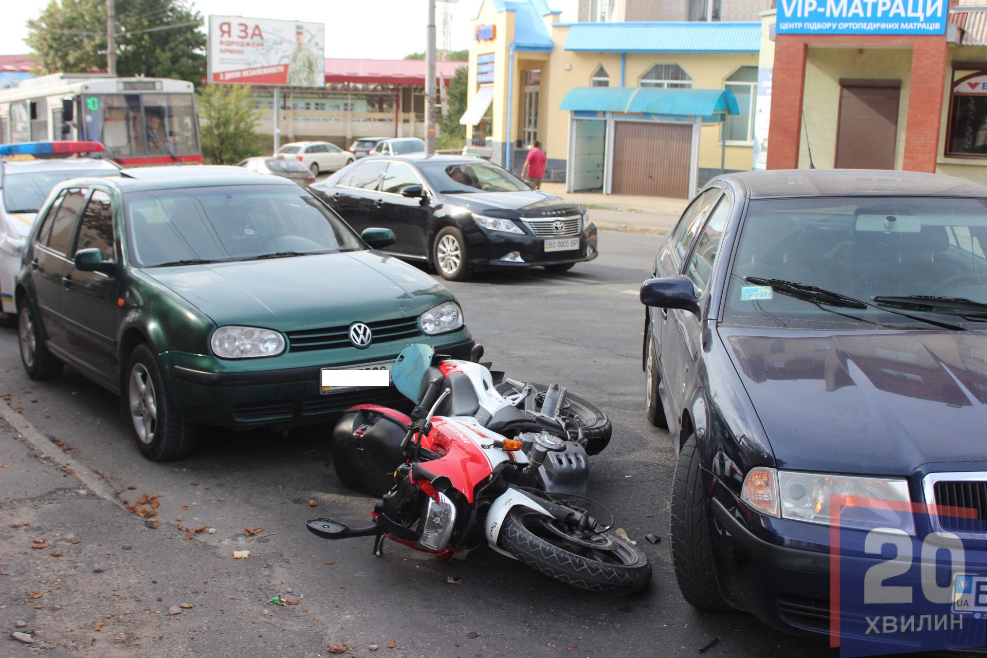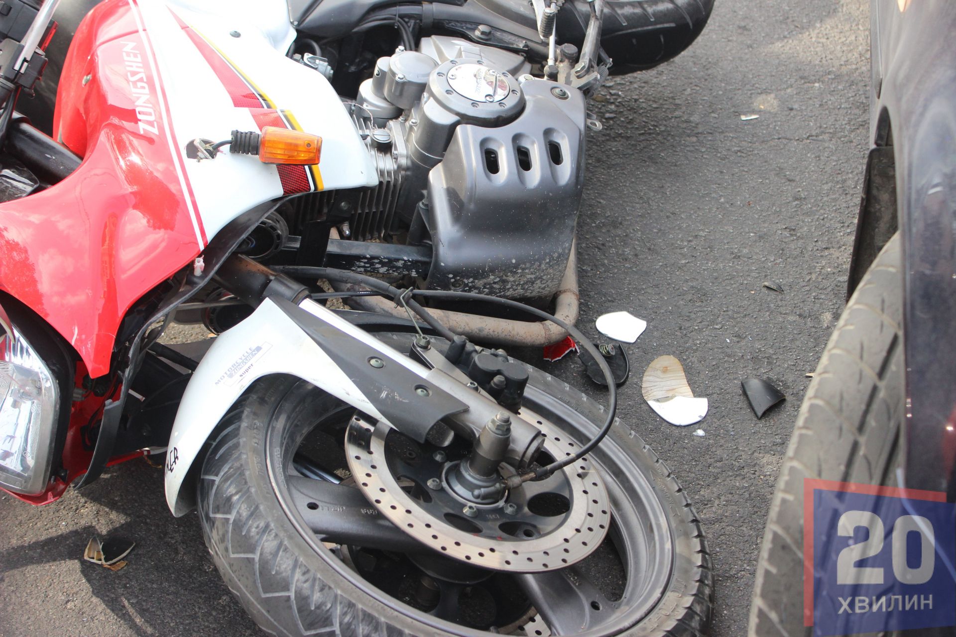 Зіткнулися Shcoda Octavia і мотоцикл Songshen200. Під час аварії пошкодили ще припаркований Volkswagen Golf.