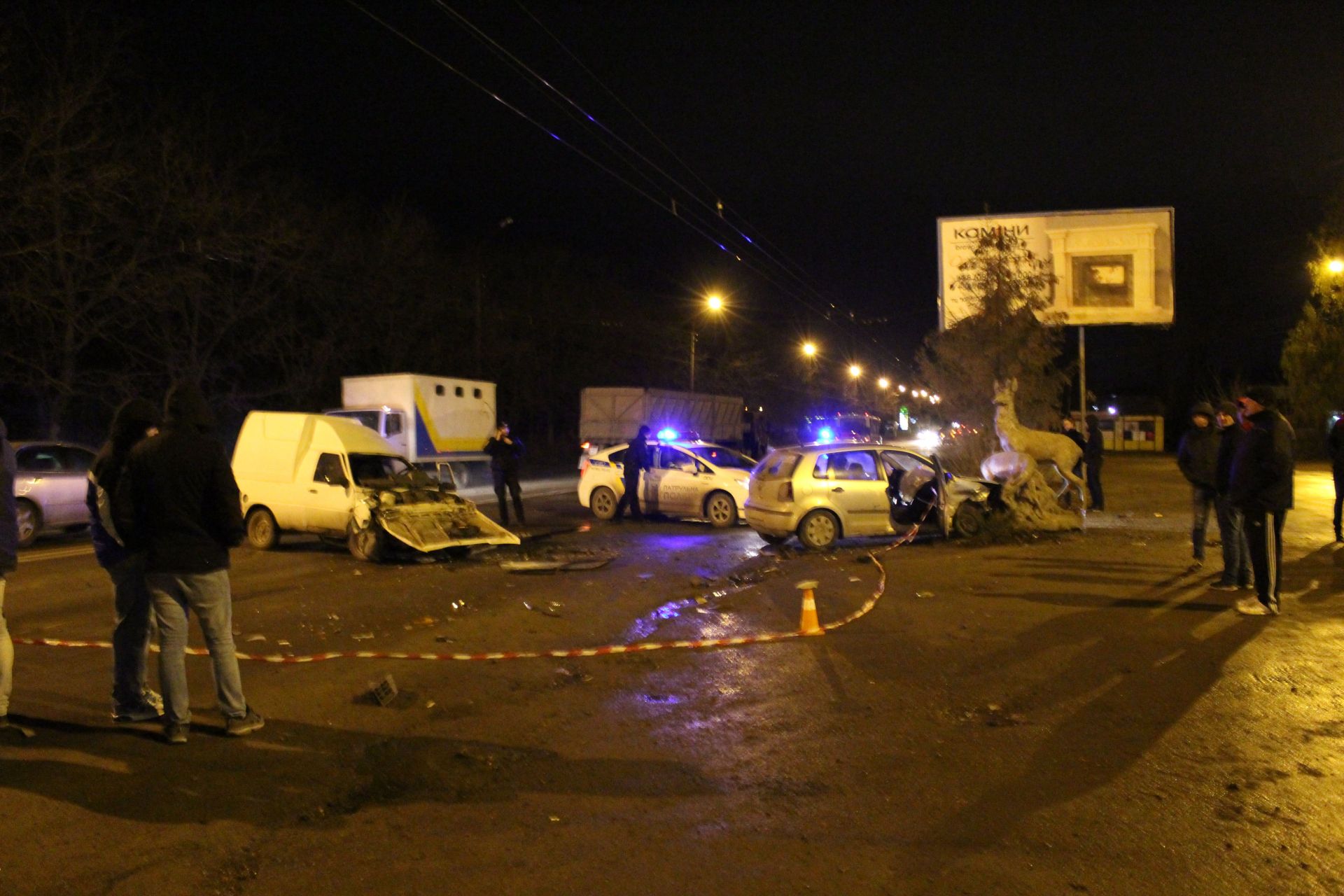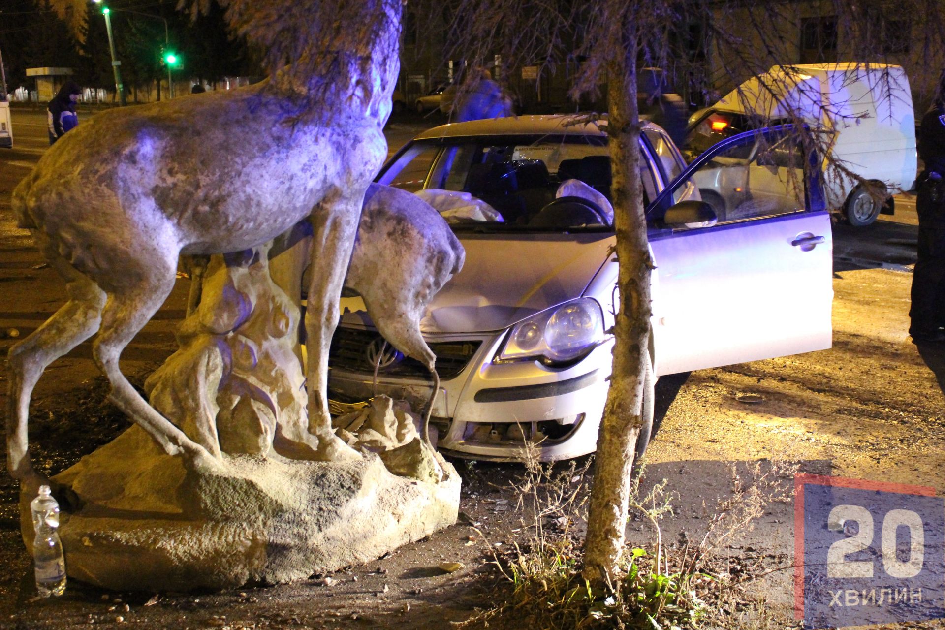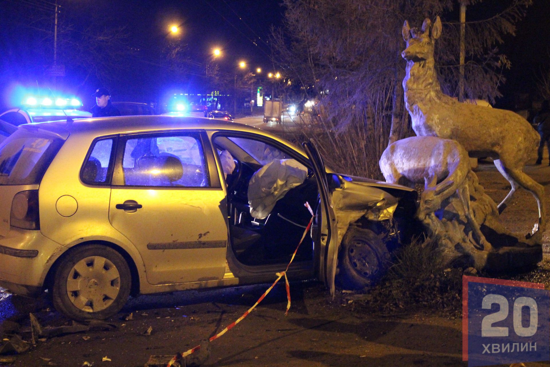У "Таврії" повністю розтрощений перед, майже відірваний капот, вибите лобове скло. Інше авто - Volkswagen Polo врізалось у статую з двох оленів, яка розташована на узбіччі.