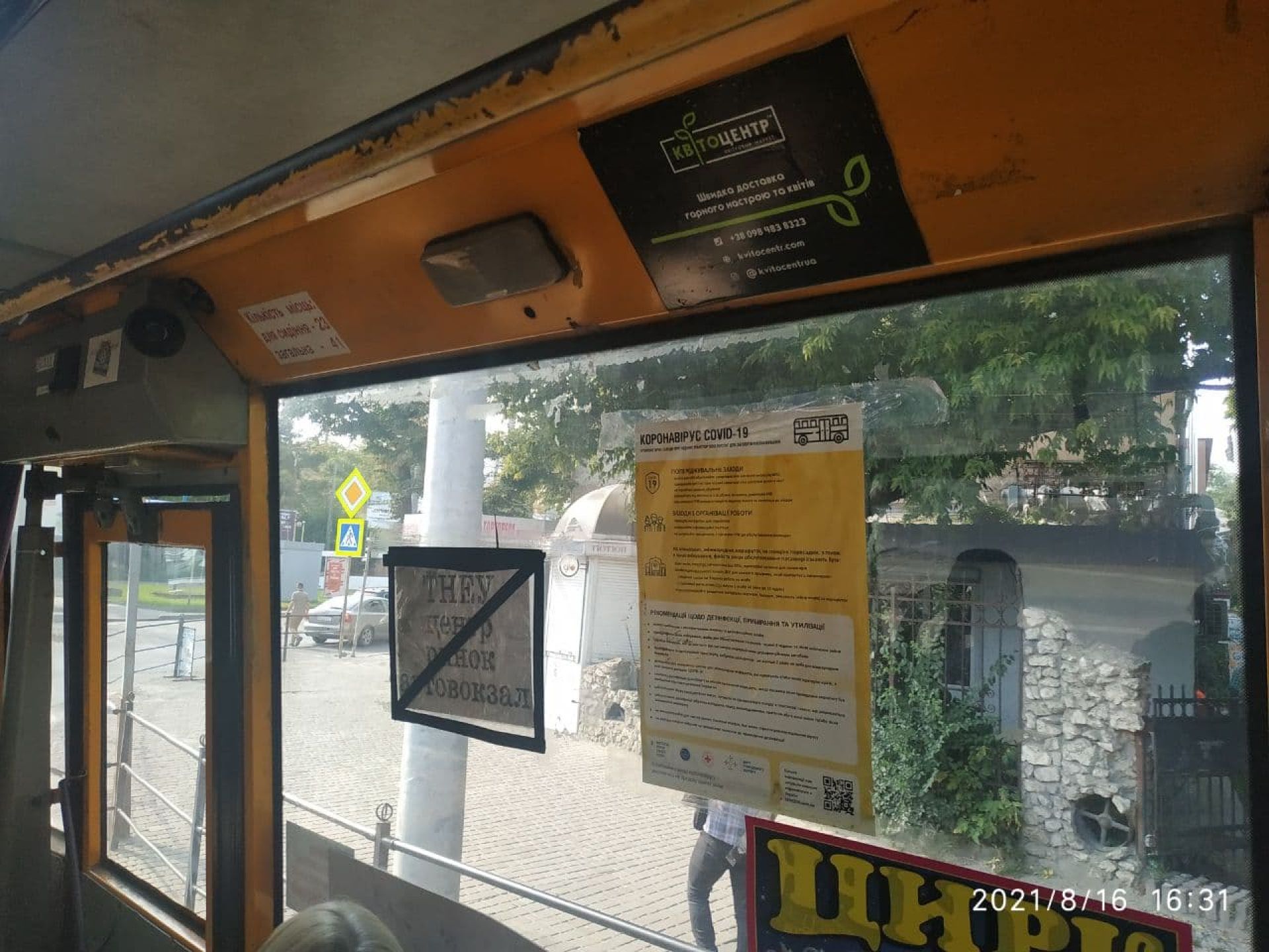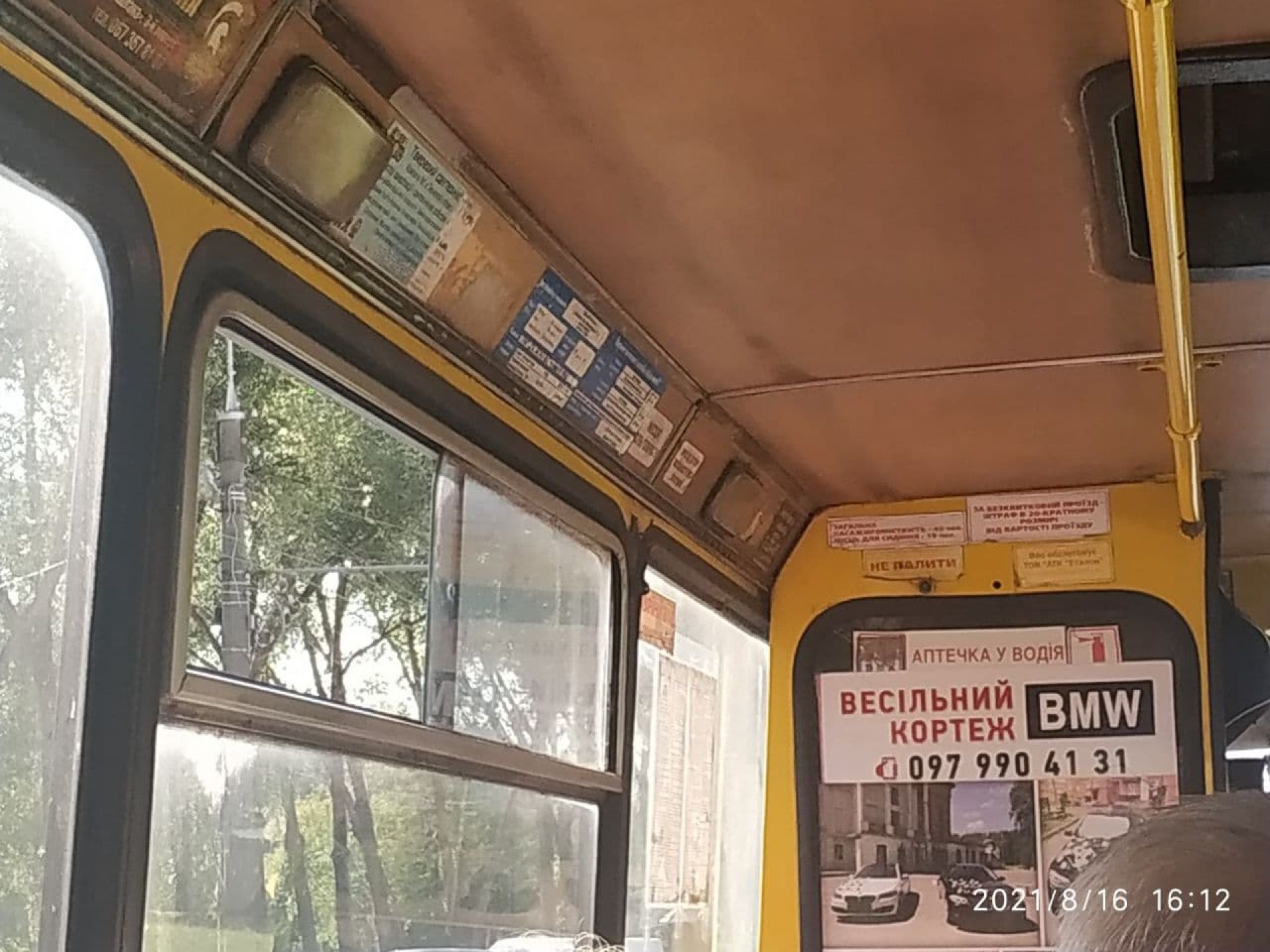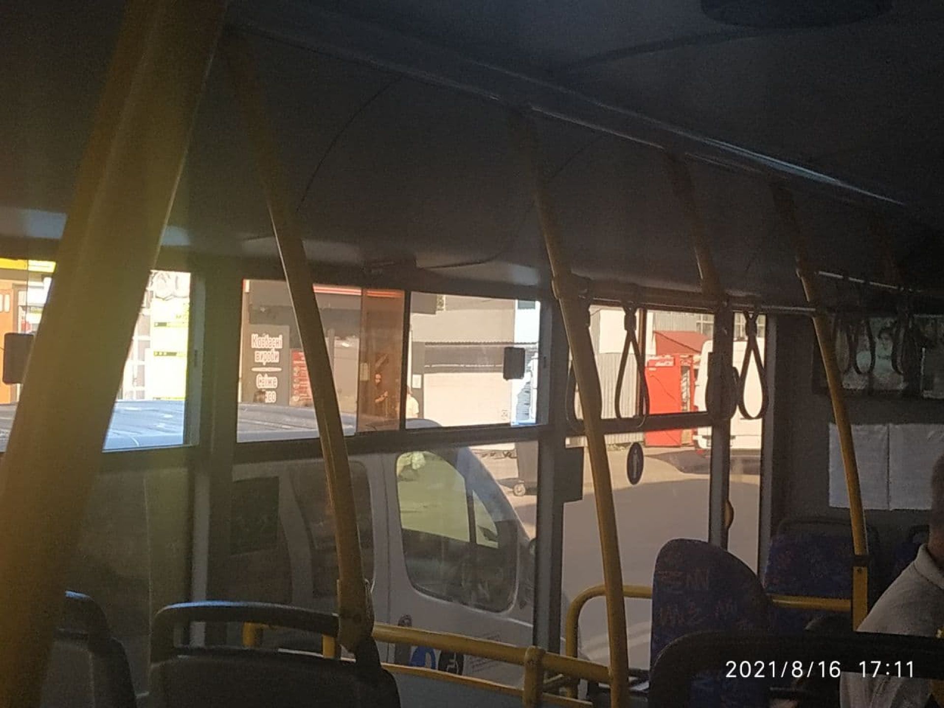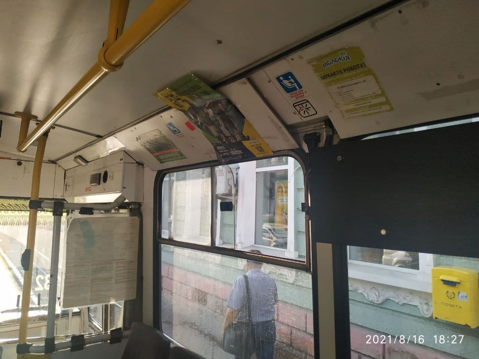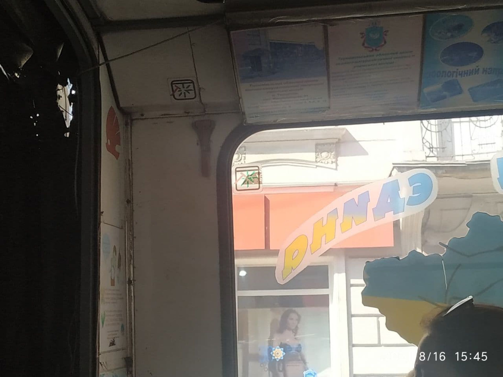 Перше, що впадає в око у цьому маршрутному таксі - купа реклами на вікнах. Якщо в попередніх бачили один-два плакати, то в цій нарахували чотири рекламних наліпки та плакати.