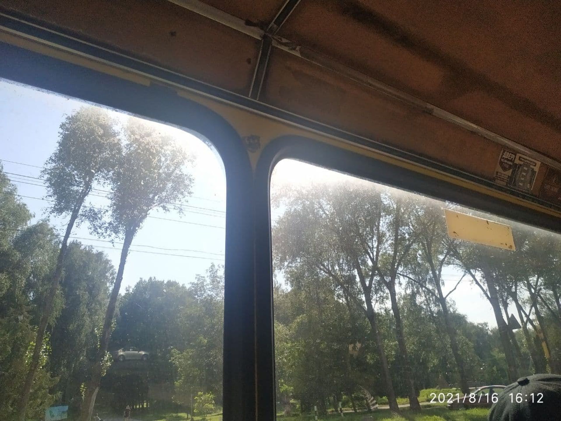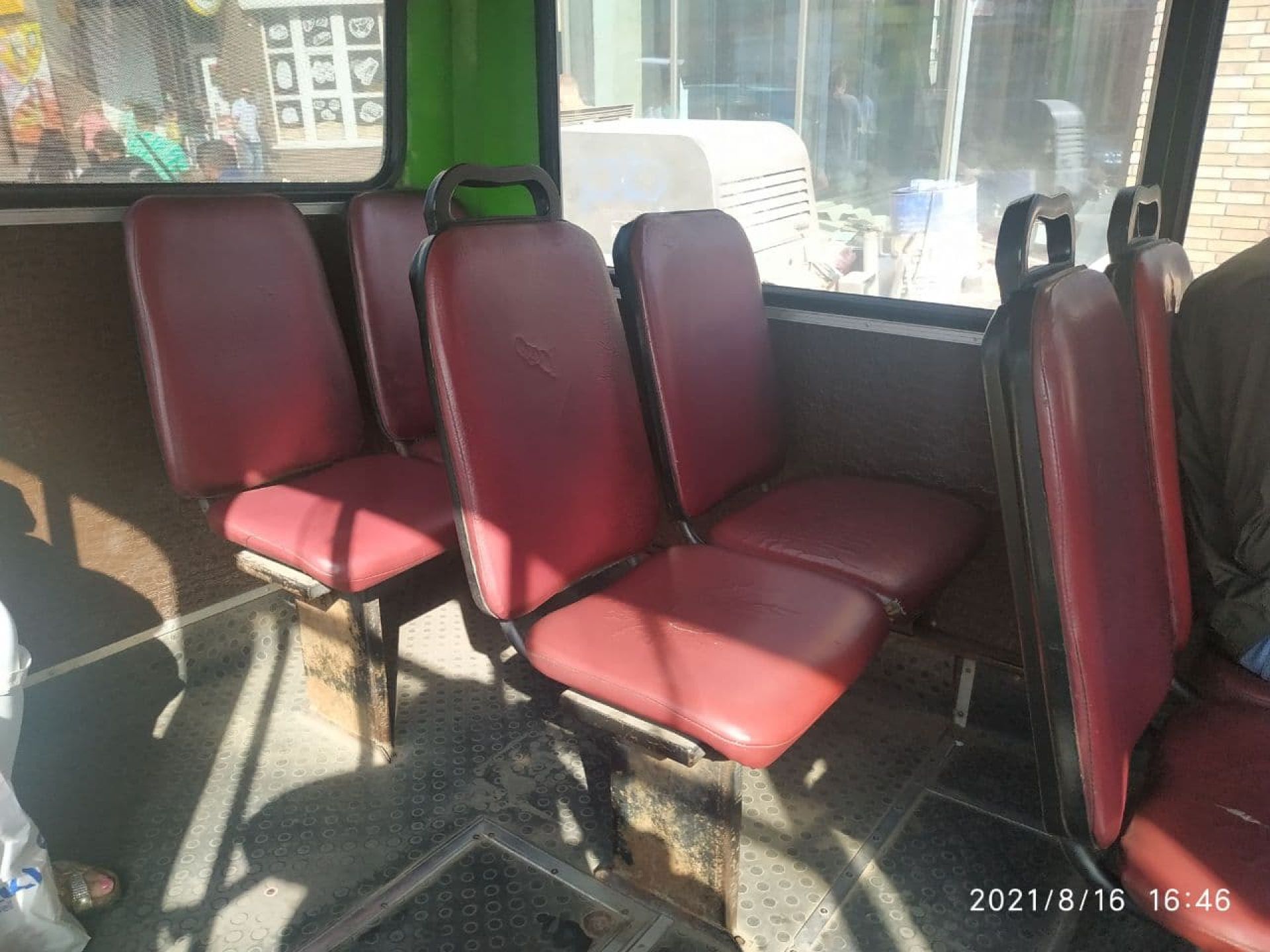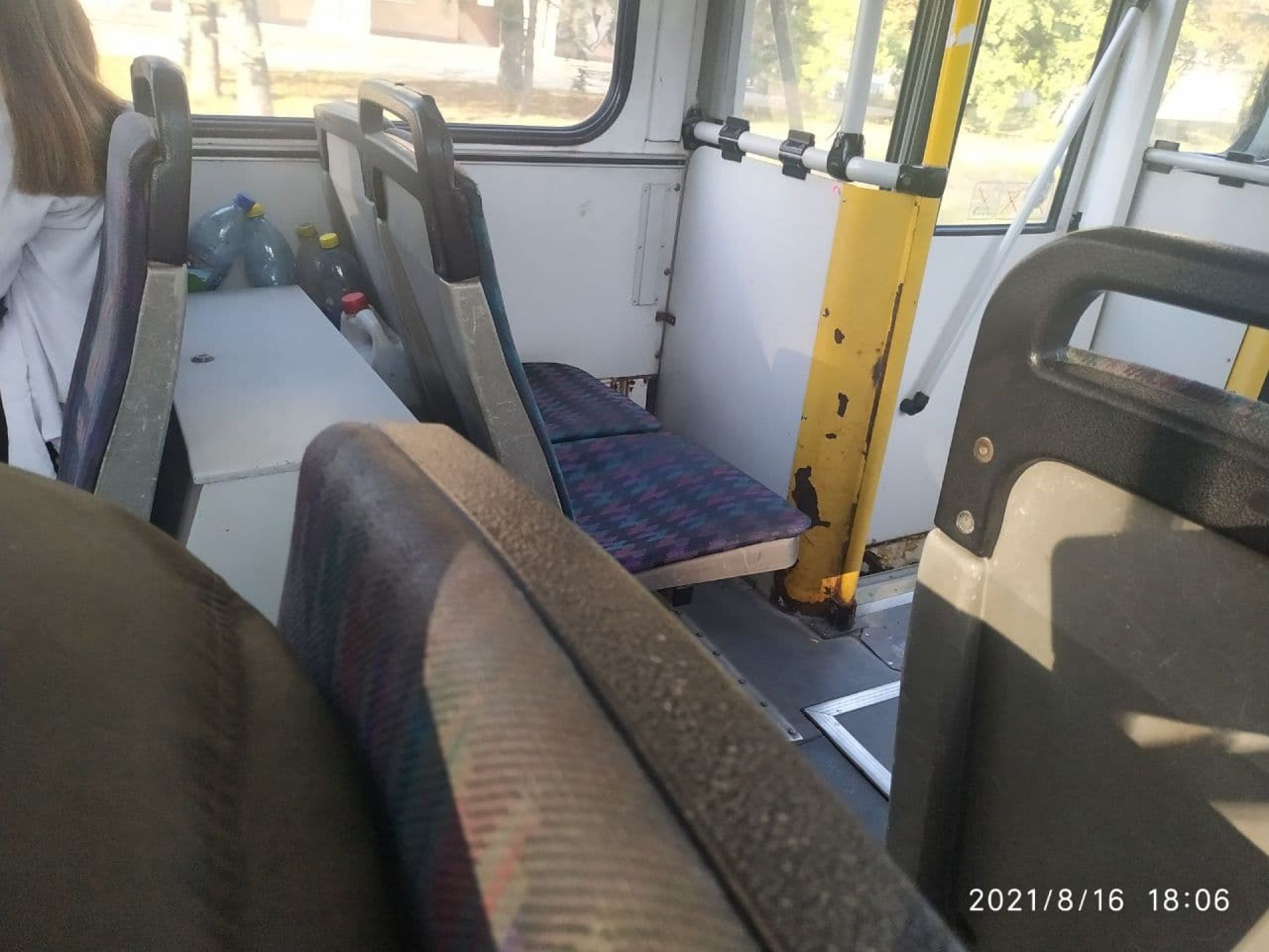 Стан вікон значно ліпший, вони чисті, а от сидіння вже обдерті. Бруду на них небагато, але зроблені вони з матеріалу, який в сонячний день дуже сильно нагрівається.. Сидіння помальовані, хтось наліпив на них жуйки.