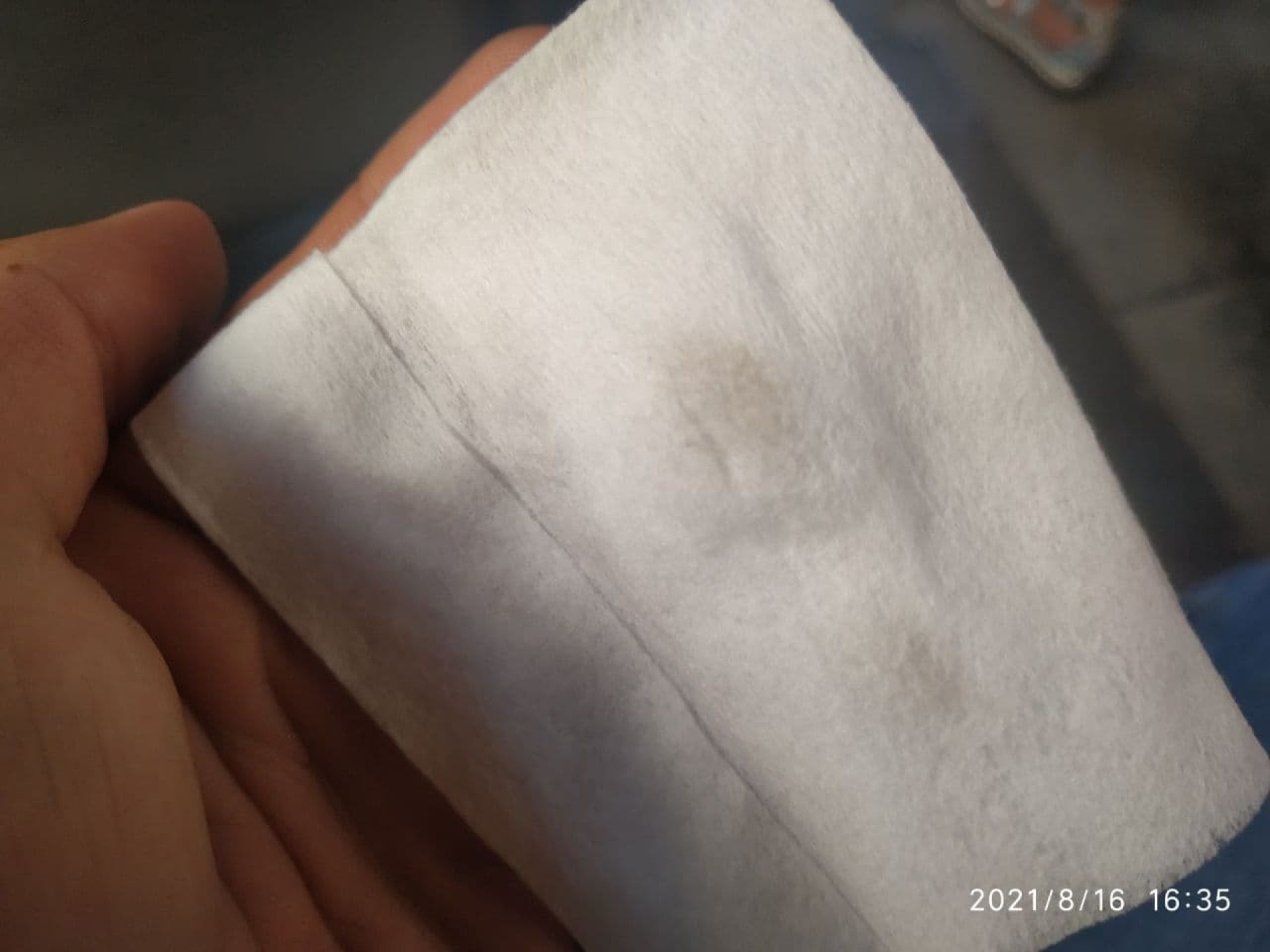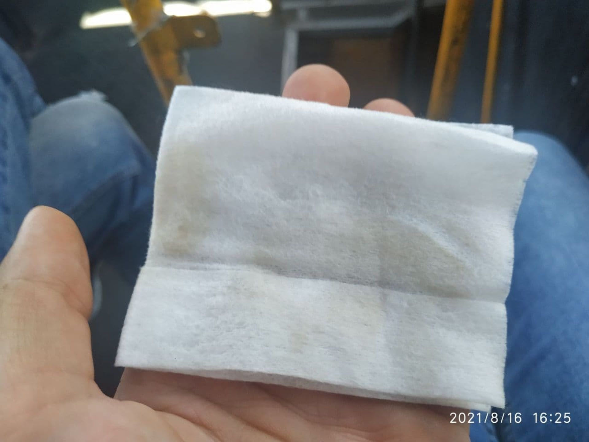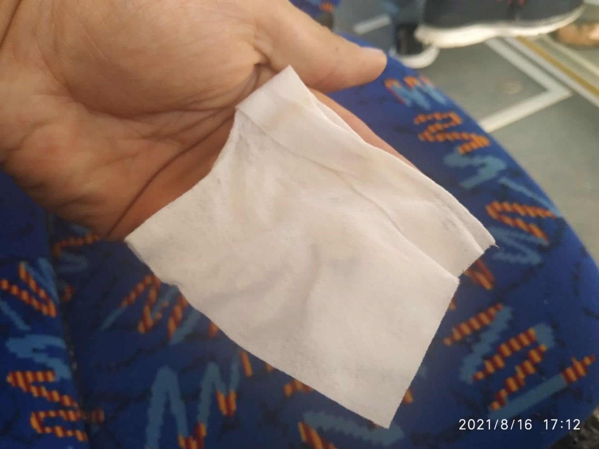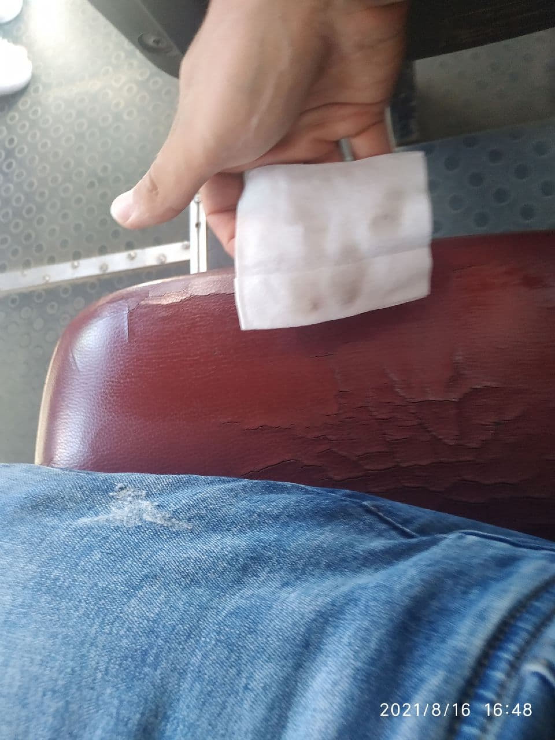 Сидіння тут були в найгіршому стані. Оббивка на багатьох місцях обірвалась. За нею видно жахливі сліди чи то бруду, чи то старої плісняви. На вологій серветці - чимало бруду.