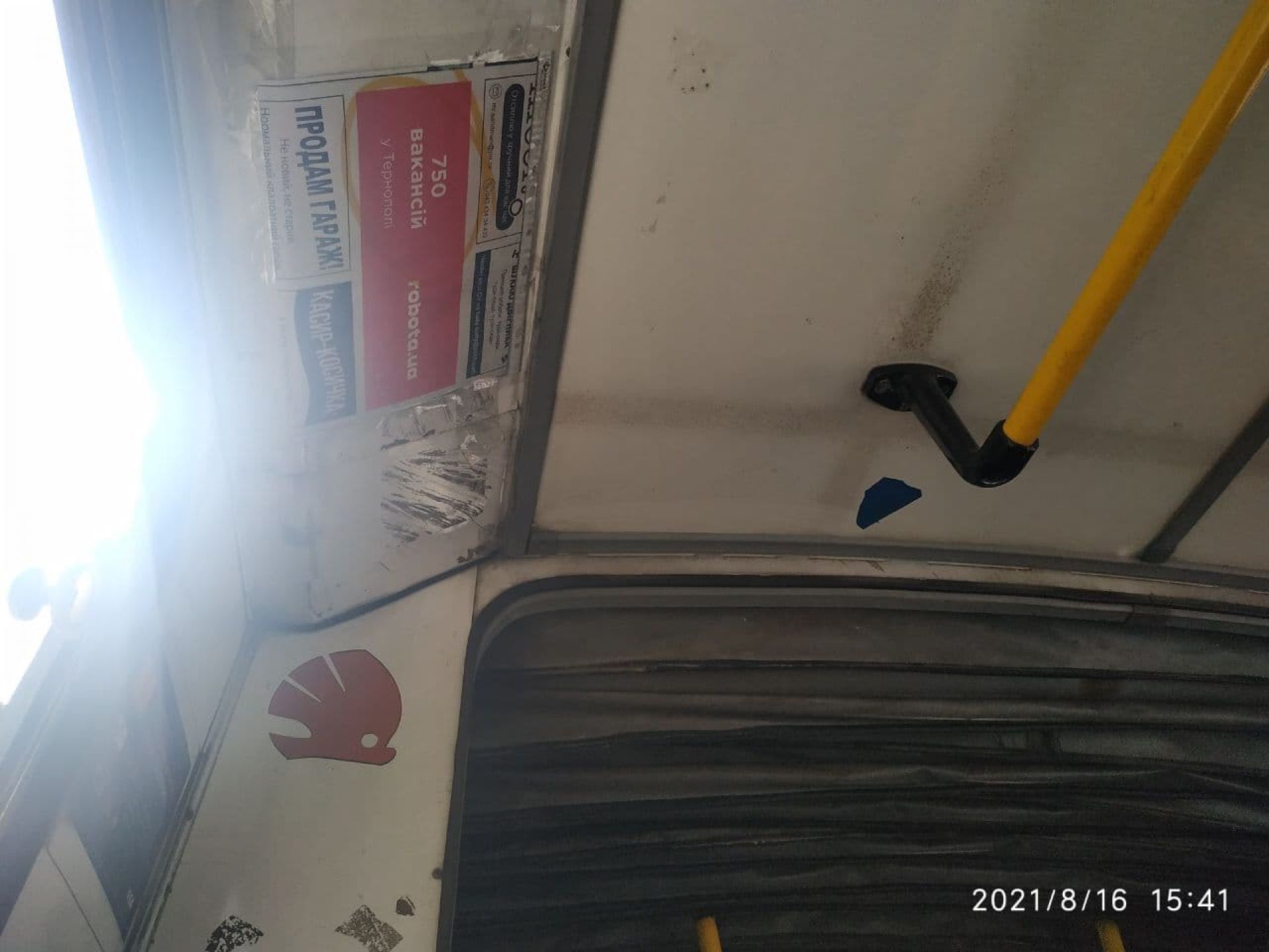 У салоні тролейбуса дуже багато слідів від реклами, та й самої реклами чимало.