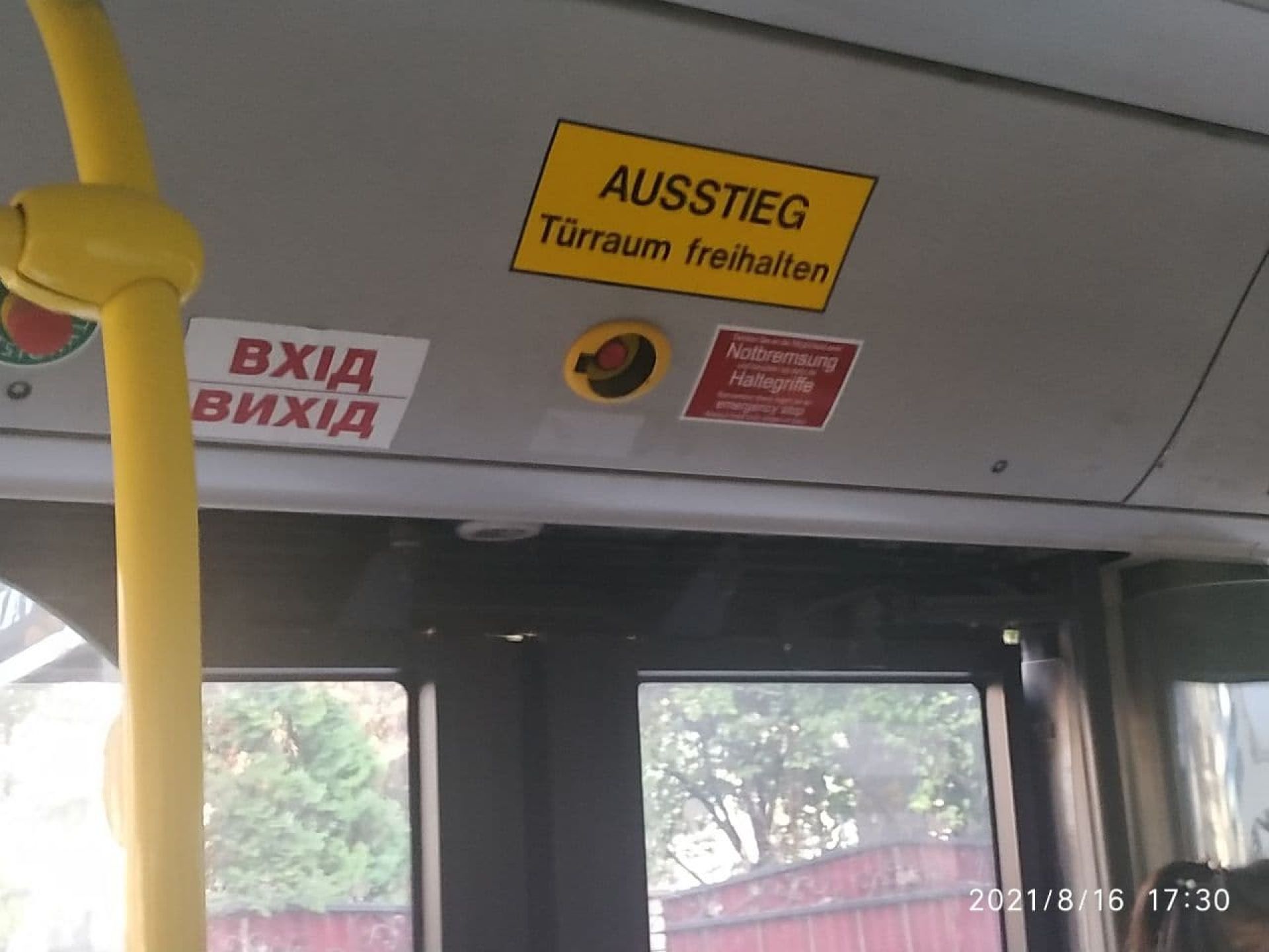 Автобус новий. Дуже чистий і просторий салон, підлога також чиста, попри те, що в маршрутку ми завітали вже о 17 годині. На відповідних місцях є молоточки, щоб розбивати вікна у випадку аварії.