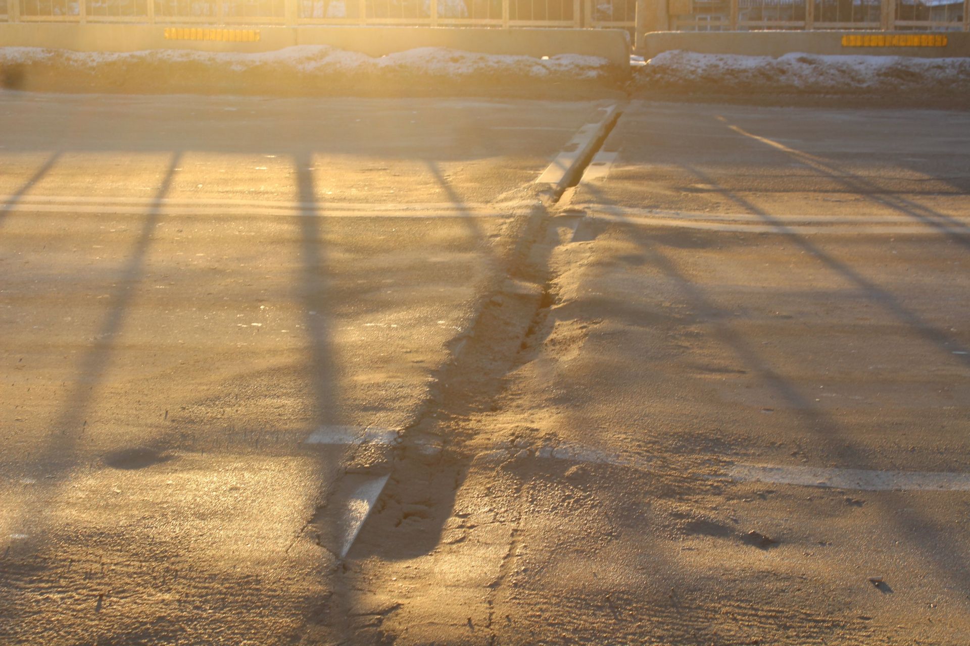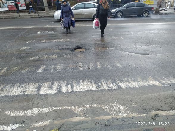 А це фото зовсім свіже, його зробили 8 лютого. Перехід на вулиці Гетьмана Івана Мазепи, дві великі вибоїни за метр від переходу по обидві сторони. У них легко вскочити та підвернути ногу, водії їх стараються оминати.