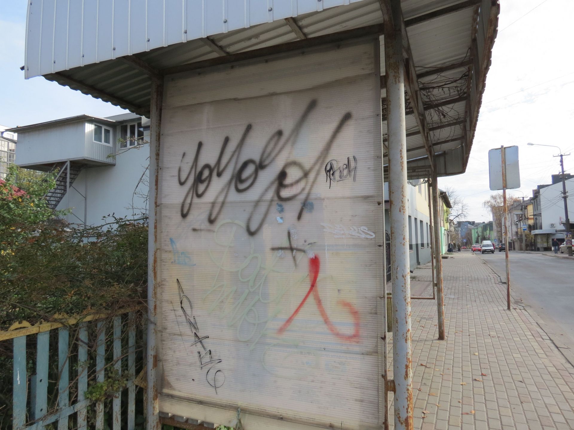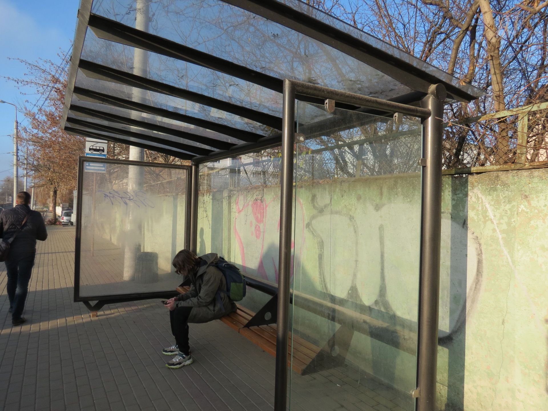 Ця зупинка схожа на попередню – іржаві металеві опори, дерев’яні лавки, які варто принаймні пофарбувати. Поруч – стара пошарпана лавка. Вся зупинка в написах та залишках реклами та афіш.