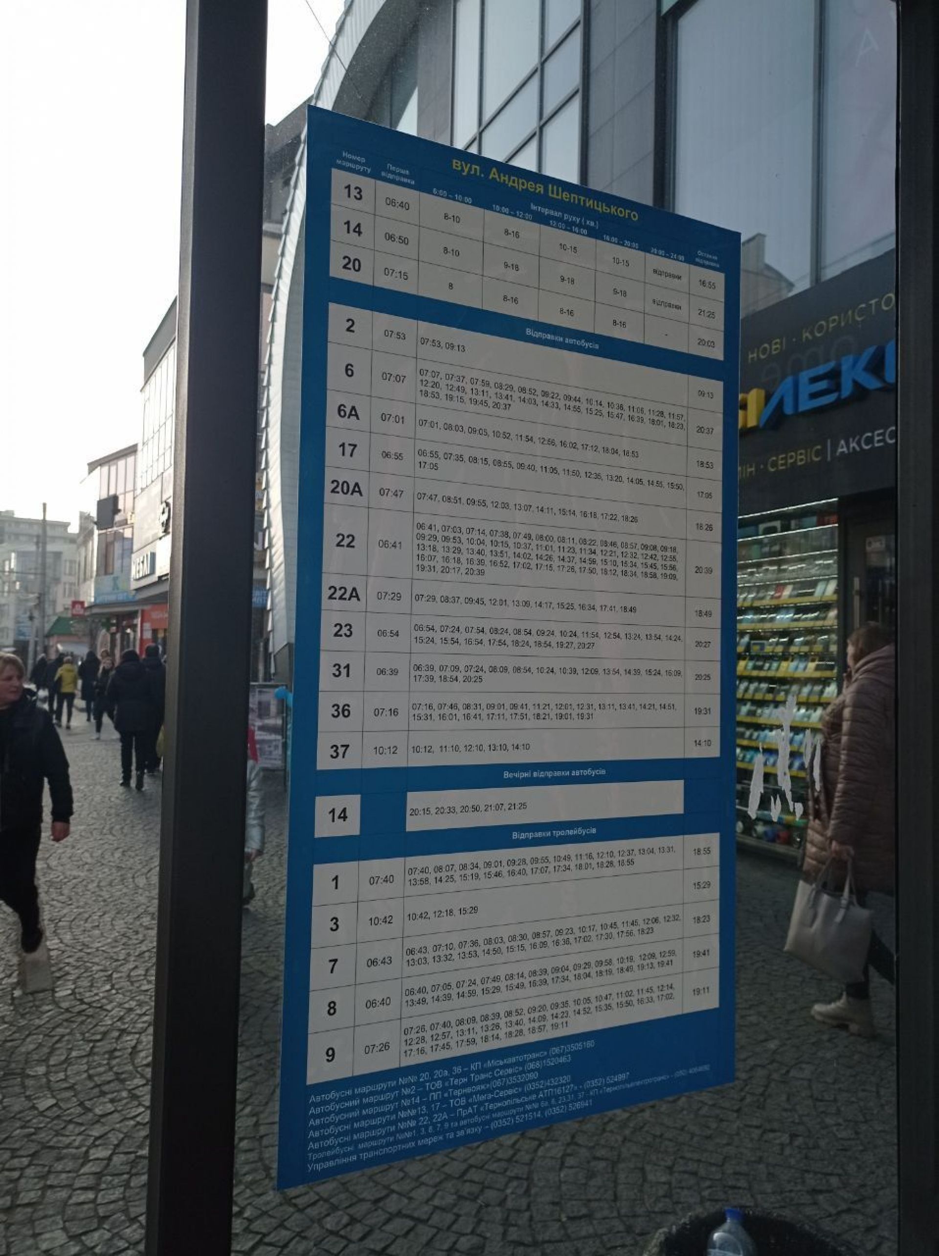 На ці зупинці є новий розклад руху громадського транспорту. На відміну від більшості інших схожих зупинок, тут немає залишків старих афіш та реклами. Вона виглядає більш охайно.