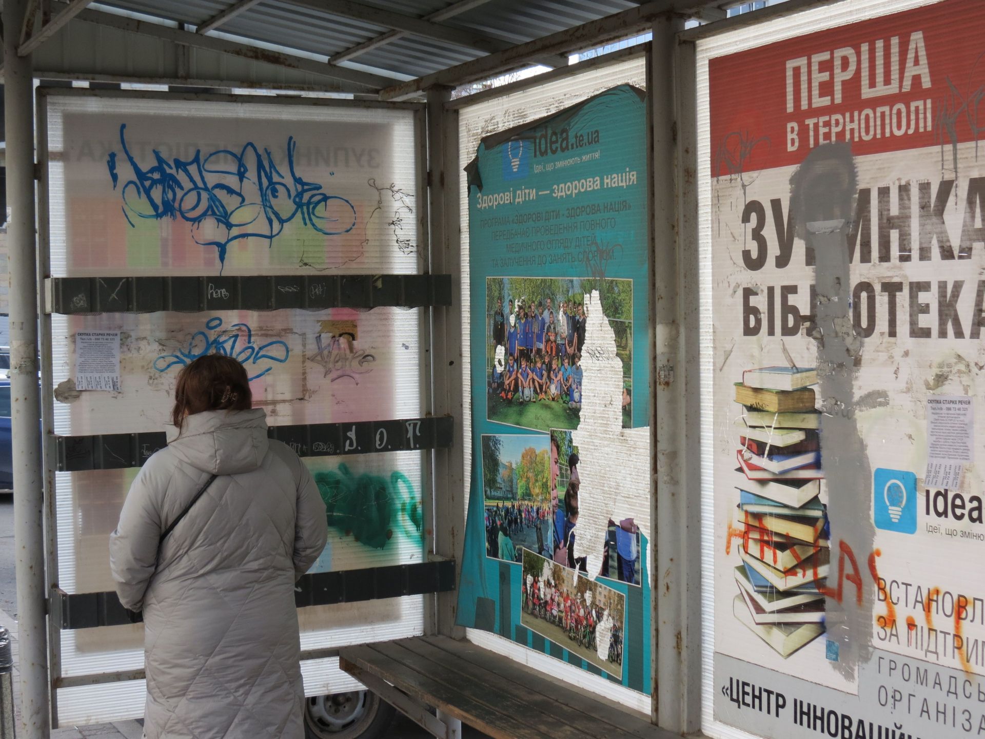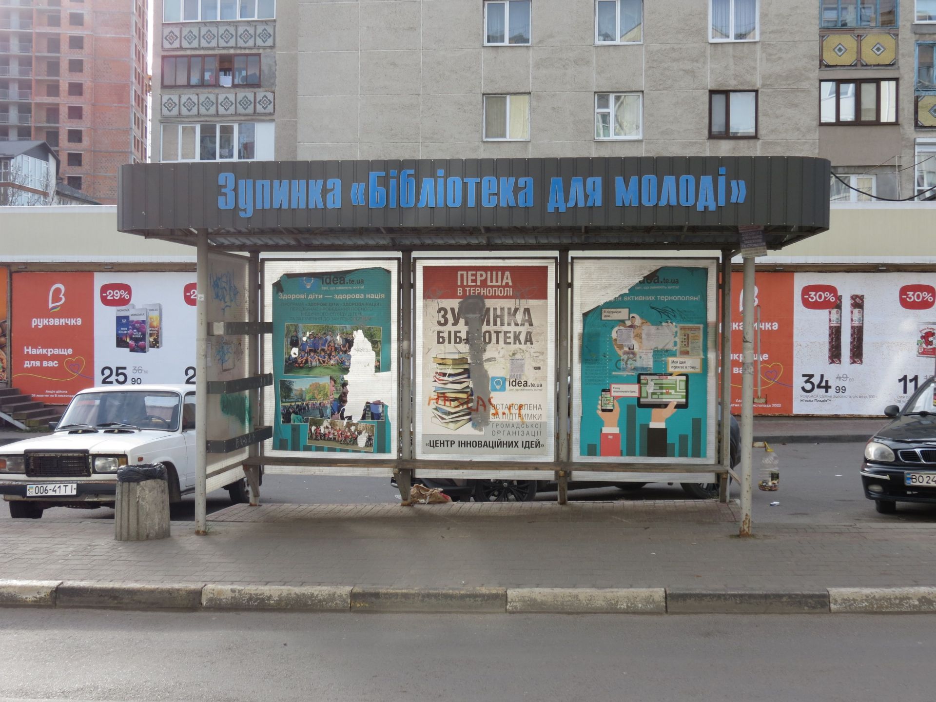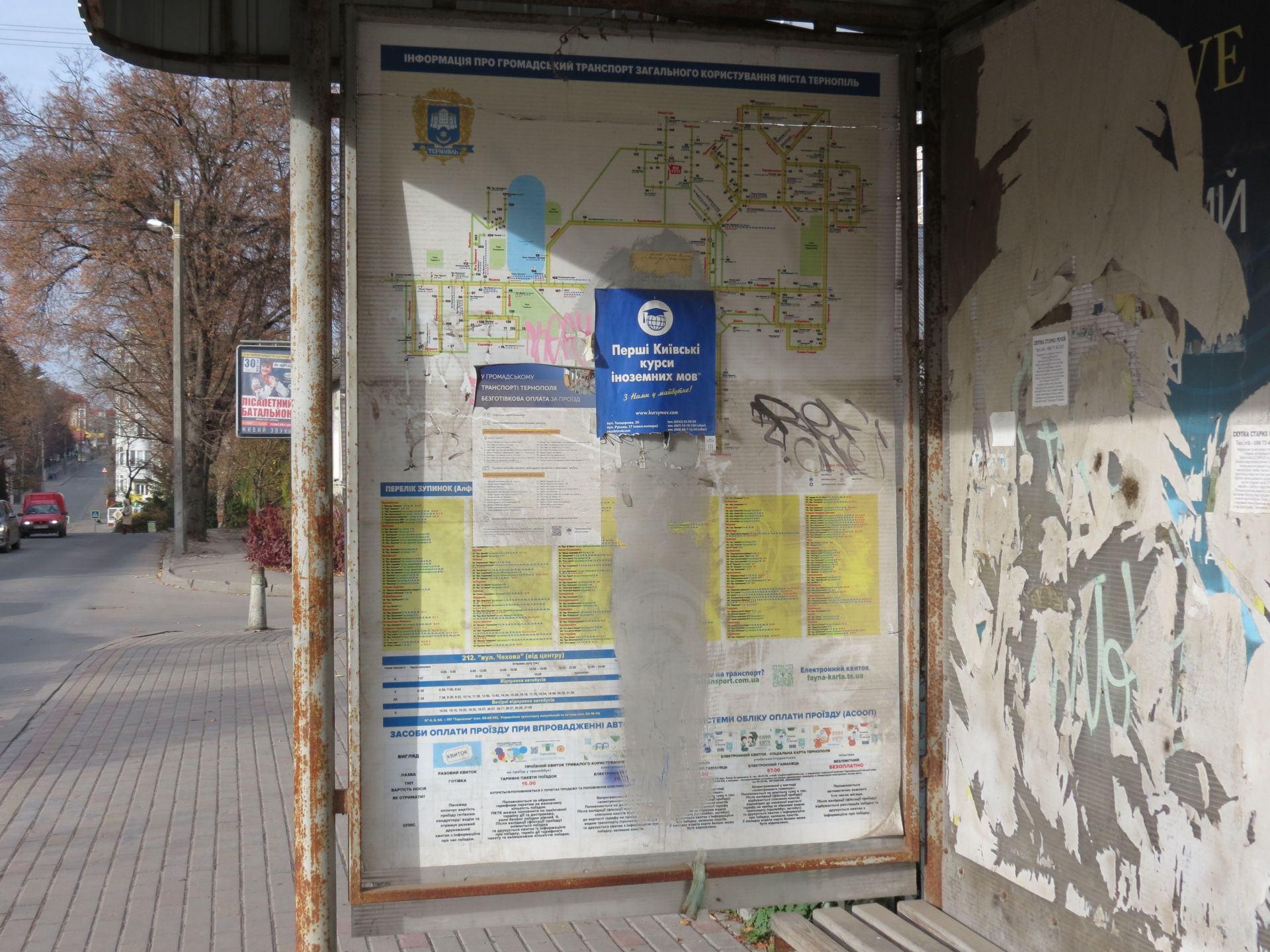 Одна зі старих зупинок міста. Ні інформаційного монітору, ні терміналу. Вся зупинка в алишках афіш та рекламі.