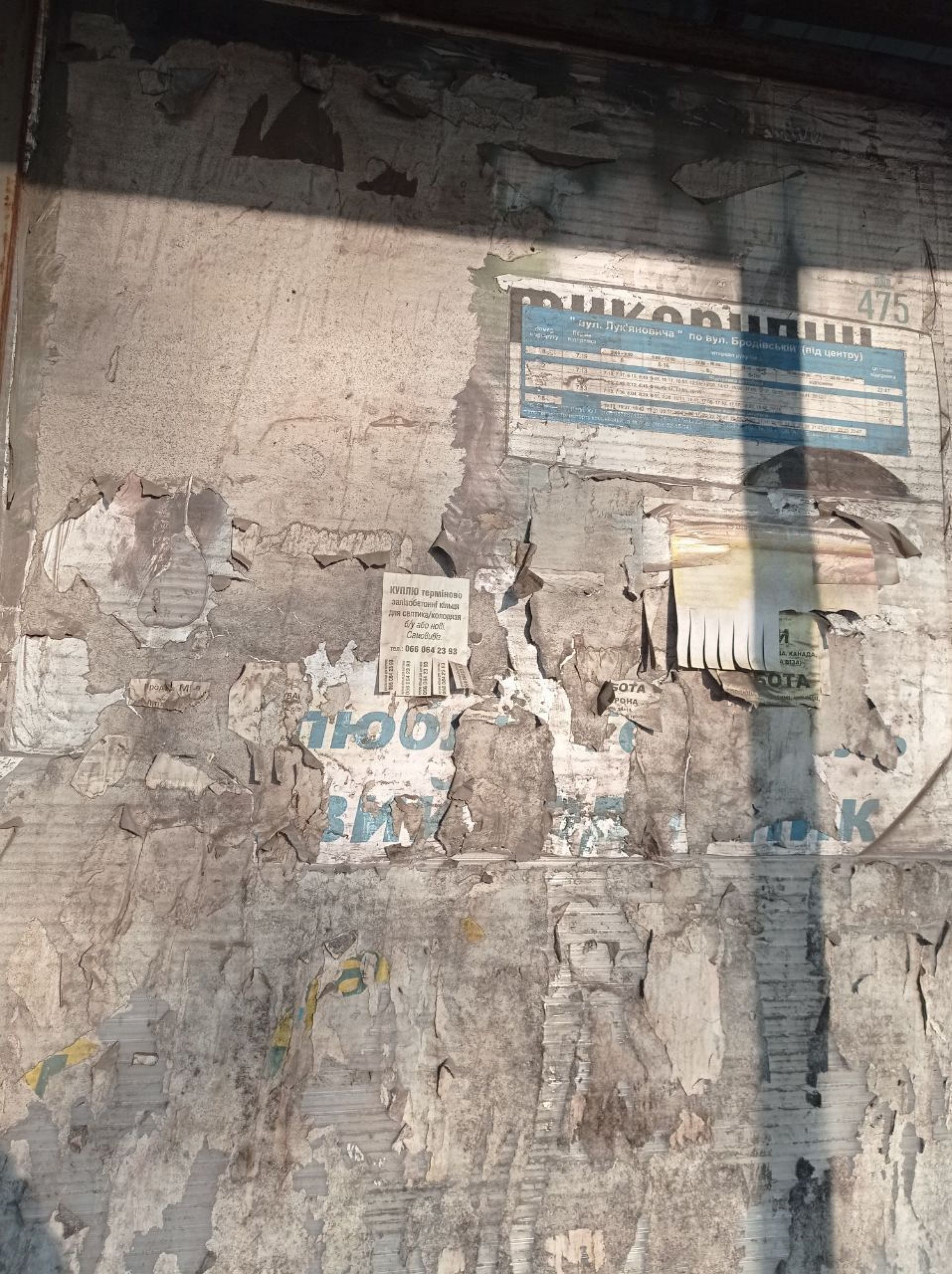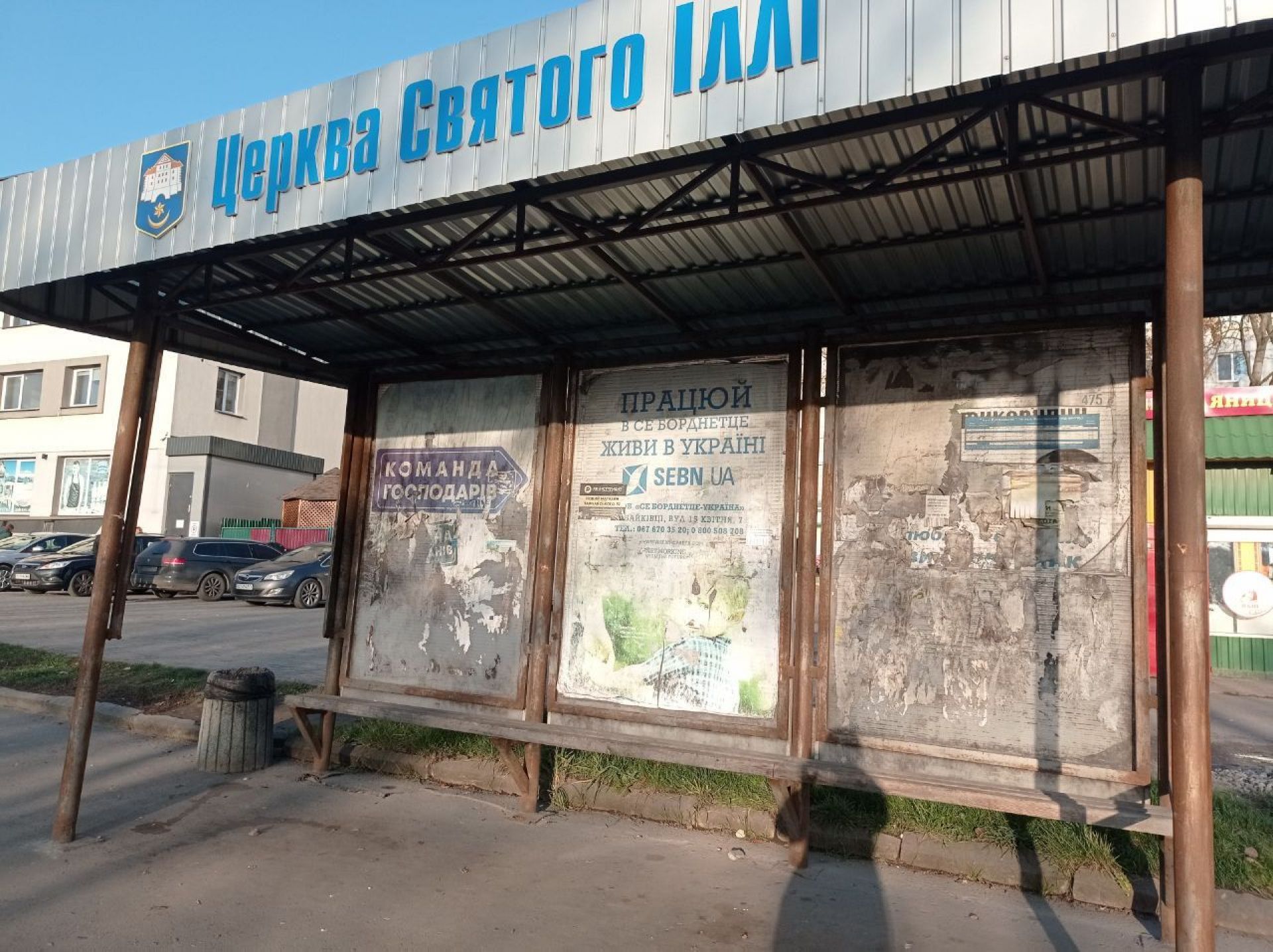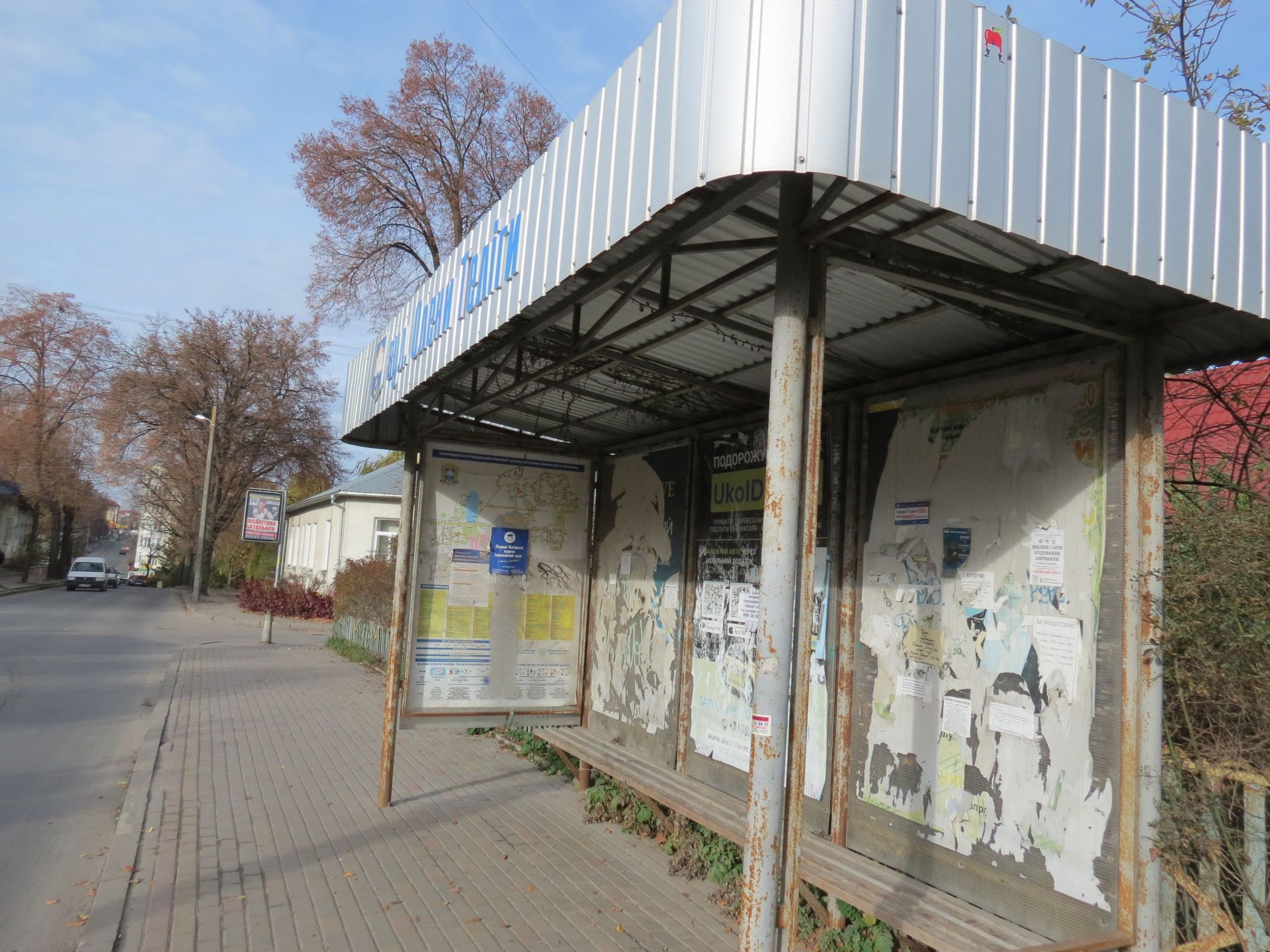 Зупинка не в найкращому стані. Вона була обклеєна рекламою та різними оголошеннями, від яких лишилися залишки клею та паперу. Нового розкладу громадського транспорту не було. Фарба з дерев’яної лавки давно облущилась. Металеві опори – іржаві.