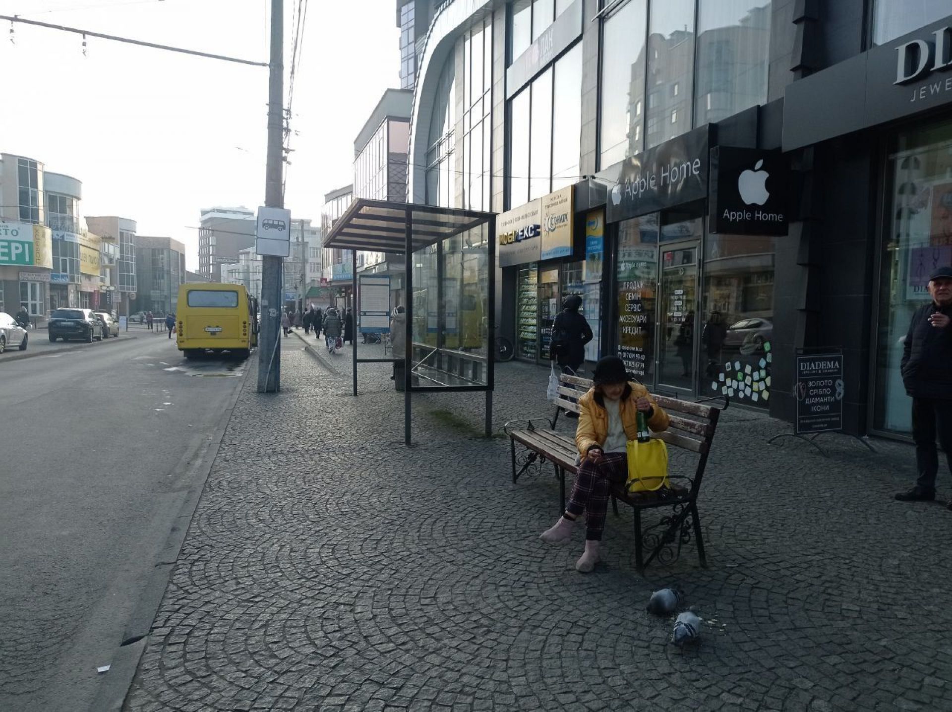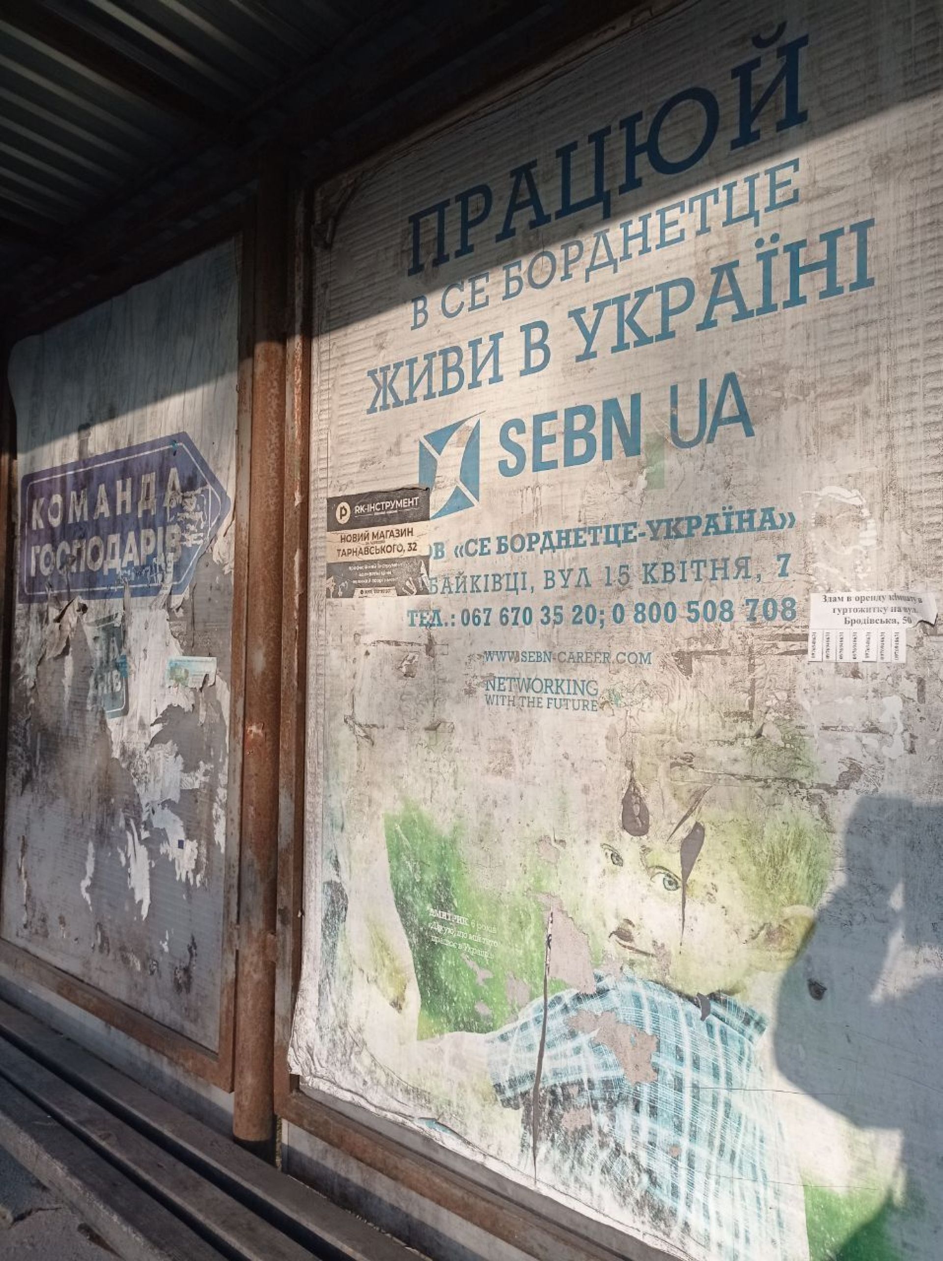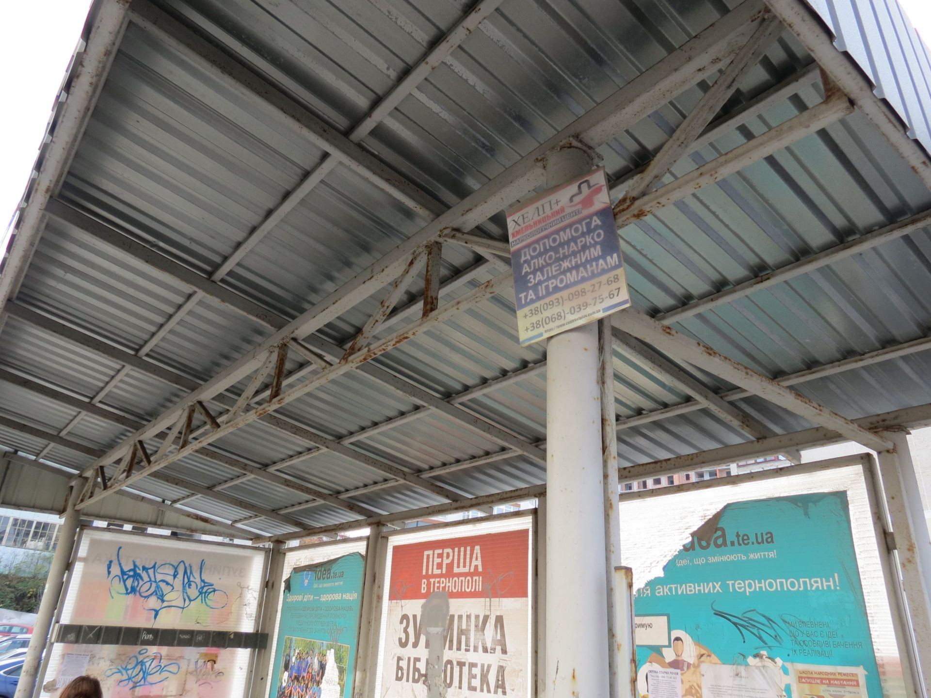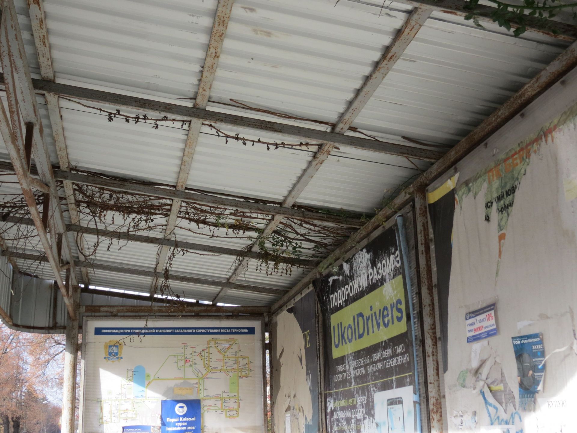 Зупинка не в найкращому стані. Вона була обклеєна рекламою та різними оголошеннями, від яких лишилися залишки клею та паперу. Нового розкладу громадського транспорту не було. Фарба з дерев’яної лавки давно облущилась. Металеві опори – іржаві.