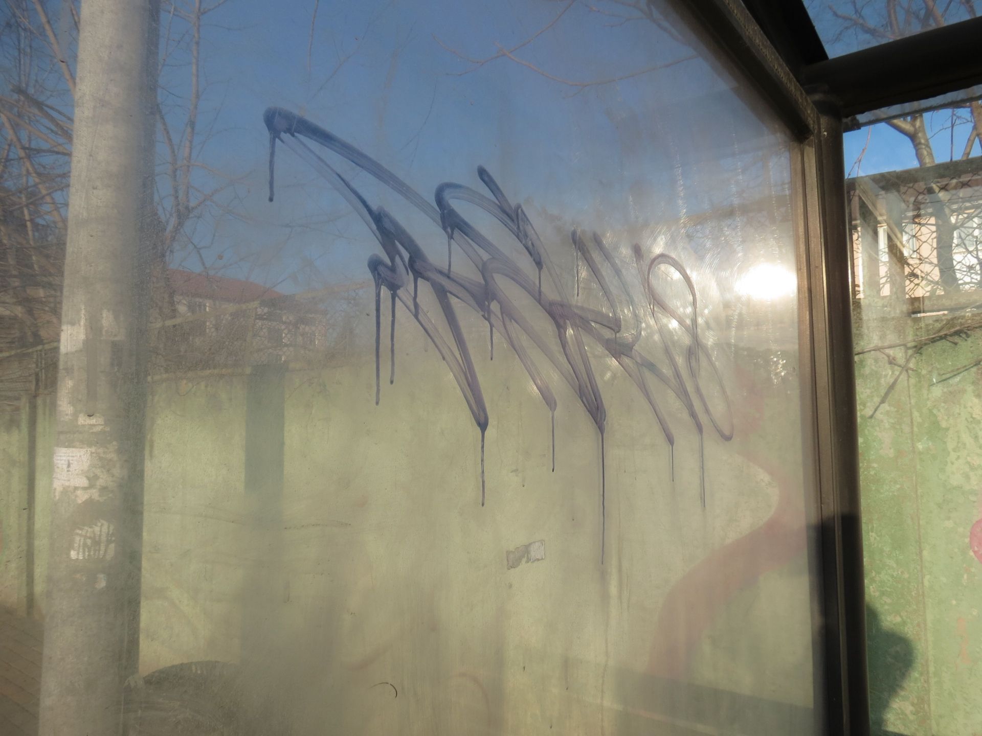 Тут одна з нових скляних зупинок. На ній – малюнок вандалів. Зупинка «замурзана», її варто почистити від бруду та пилу, бо прозоре скло стало темно–сірим.