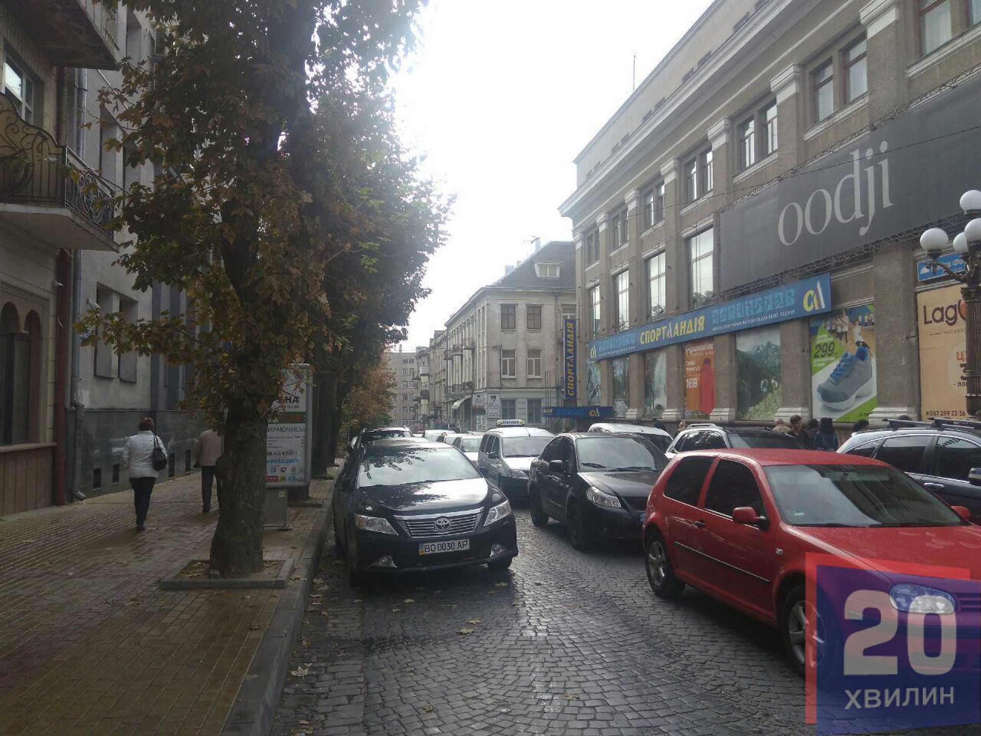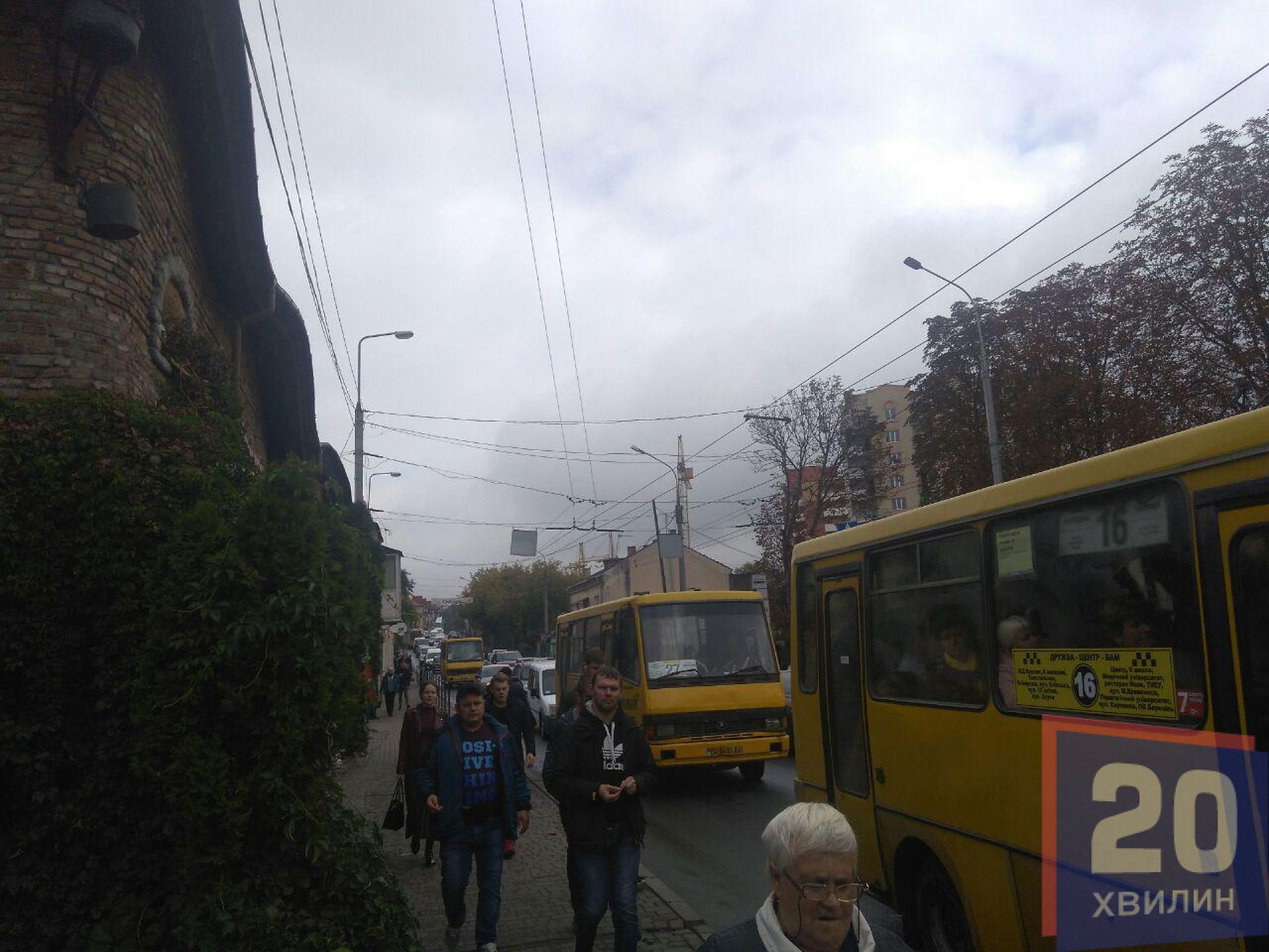 Великі затори утворились на центральних вулицях та біля ринку. Автомобілі повільно просуваються на Шептицького, Живова, Руській, Коперника, Богдана Хмельницького та Гоголя. Великі затори утворились і на вулиці Збаразькій. Тут рух транспорту ще й сповільнюють пішоходи, які по одному перебігають дорогу у місцях з вимкненими світлофорами.