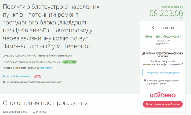 Як свідчать дані платформи державних закупівель Prozorro, на ремонт витратили 68 203 грн. Послугу замовило управління ЖКГ, благоустрою та екології міської ради замовили у ТОВ «Техномістбуд холдинг».