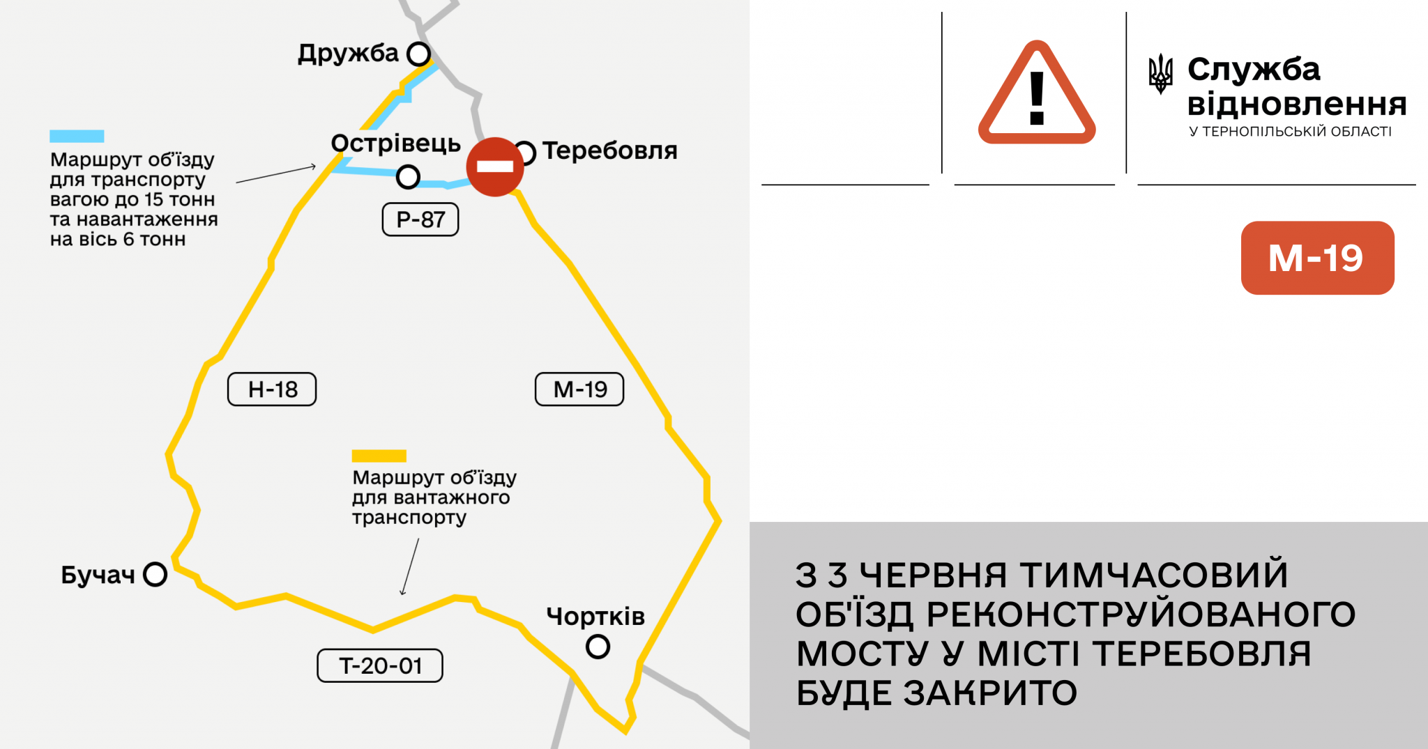 Рух тимчасовою переправою буде закрито для всіх видів транспорту. Об’їхати реконструйований міст на трасі М-19 можна 2 шляхами:
