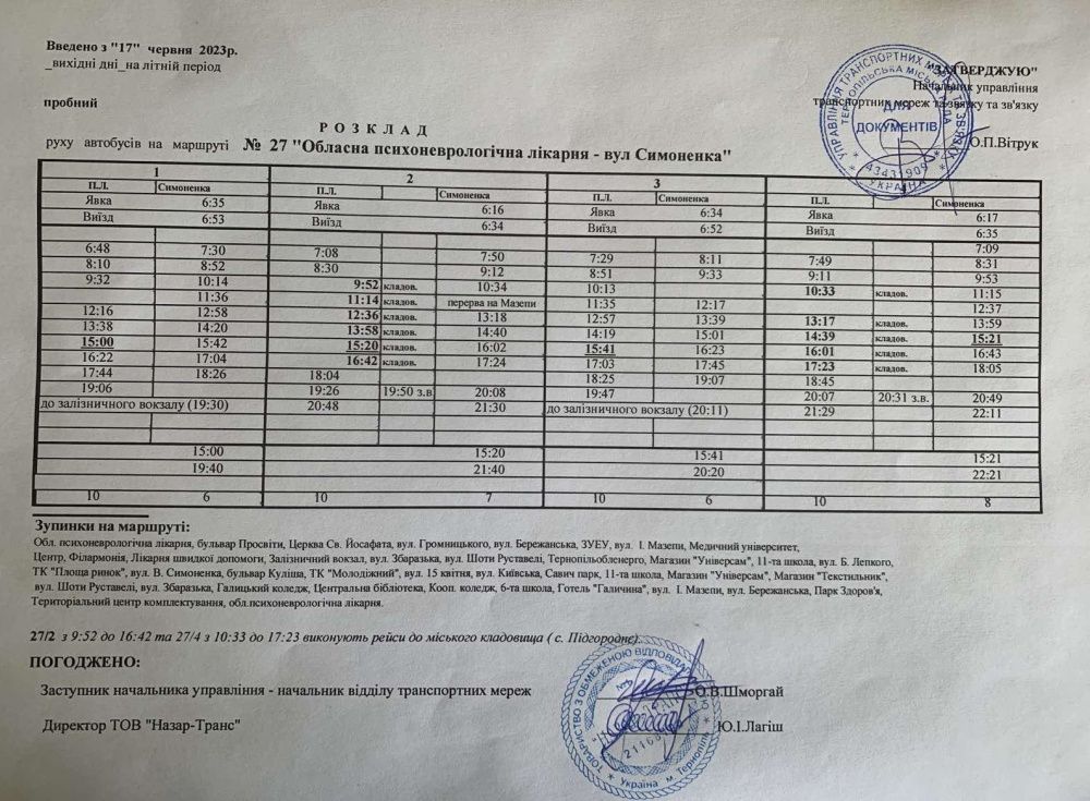 У Тернополі збільшать кількість автобусів на маршруті №27 — «Обласна психоневрологічна лікарня – вул. Василя Симоненка» — які курсуватимуть у вихідні на літній період.