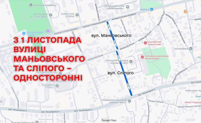 Із 1 листопада у Чорткові змінюється схема організації дорожнього руху на вулицях Маньовського та Сліпого – ці вулиці стануть односторонніми.