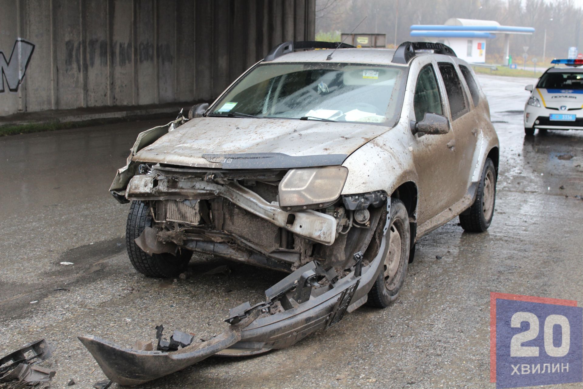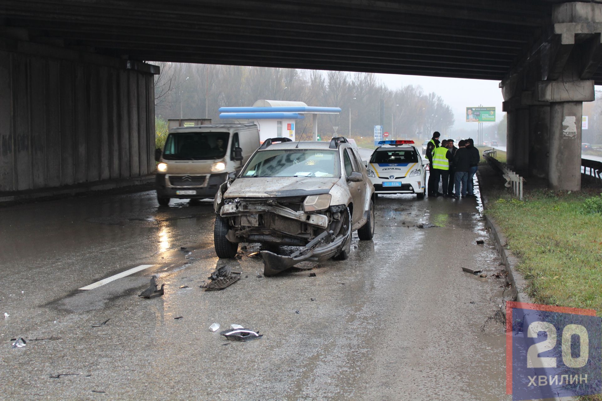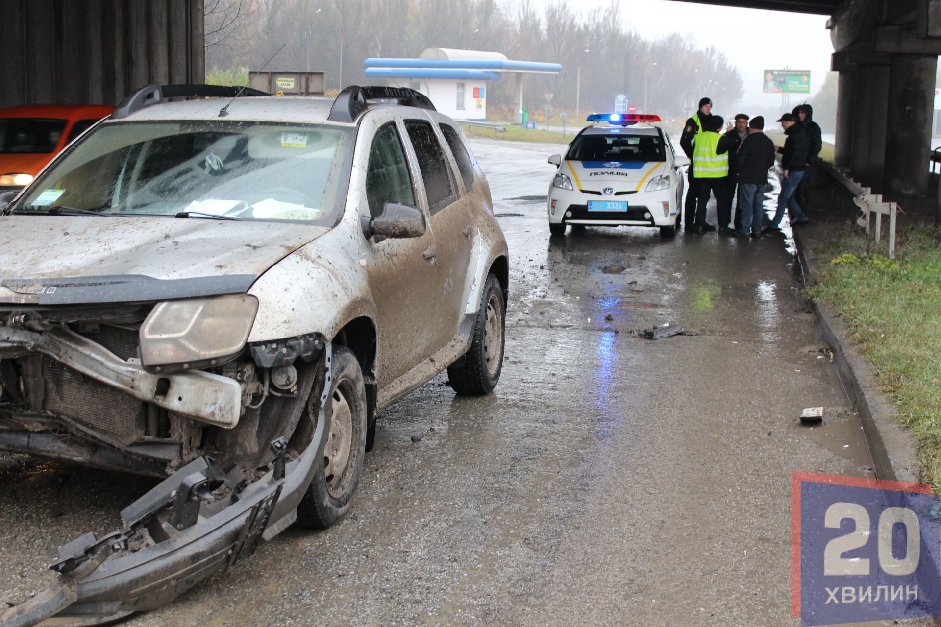 У Renault, яке стоїть під мостом, повністю розтрощений перед. КамАЗ стоїть за метрів сто, майже не пошкоджений. Біля авто патрульних кожен з водіїв намагається довести свою правоту.