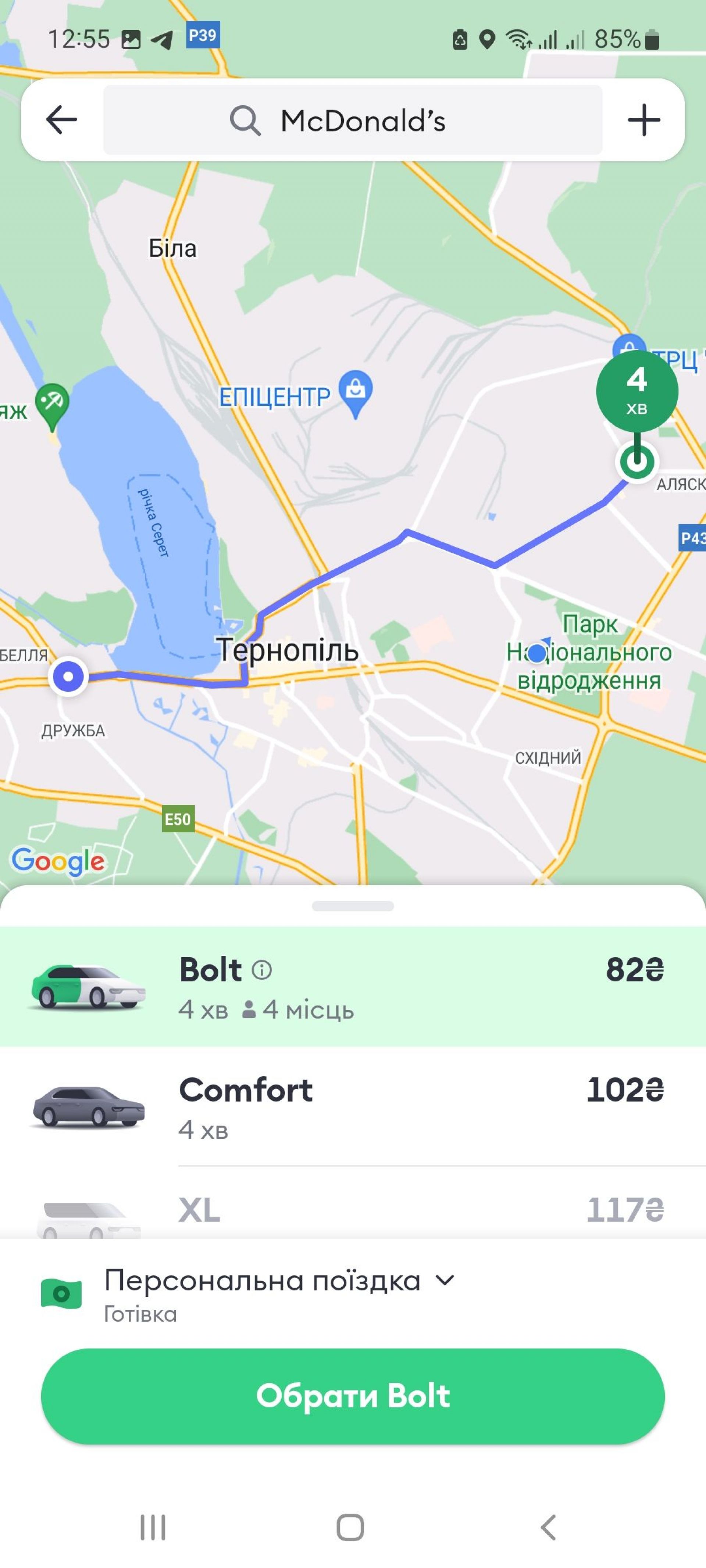 За таким же підрахунком дізнаємося, що за обрану нами довшу поїздку від церкви на вулиці Володимира Великого до McDonalds обійдеться, орієнтовно, 103 гривні.
