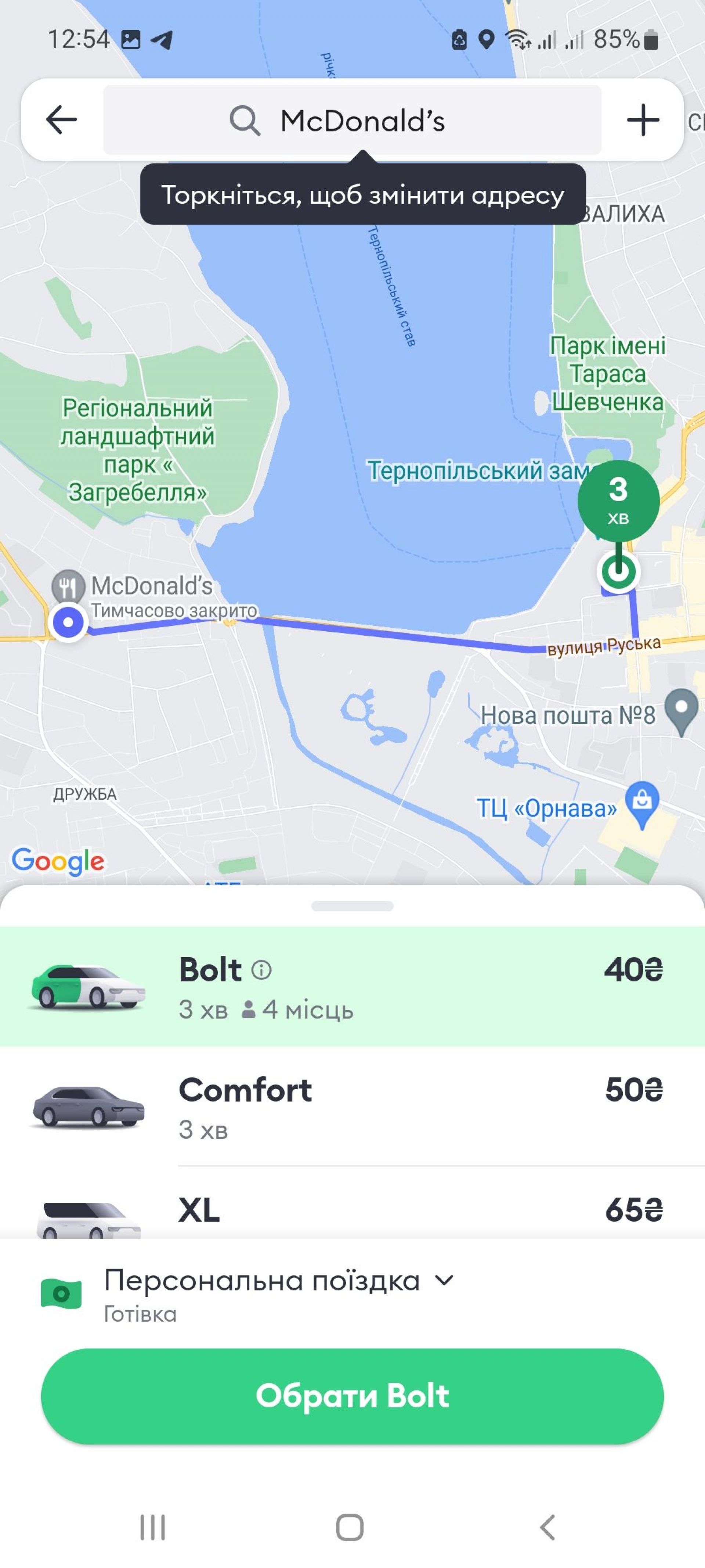 Поїздка за тарифом «економ» від готелю «Тернопіль» до McDonalds коштуватиме — 40 гривень, а від церкви святого апостола Петра, що на Володимира Великого до McDonalds —77 гривень.