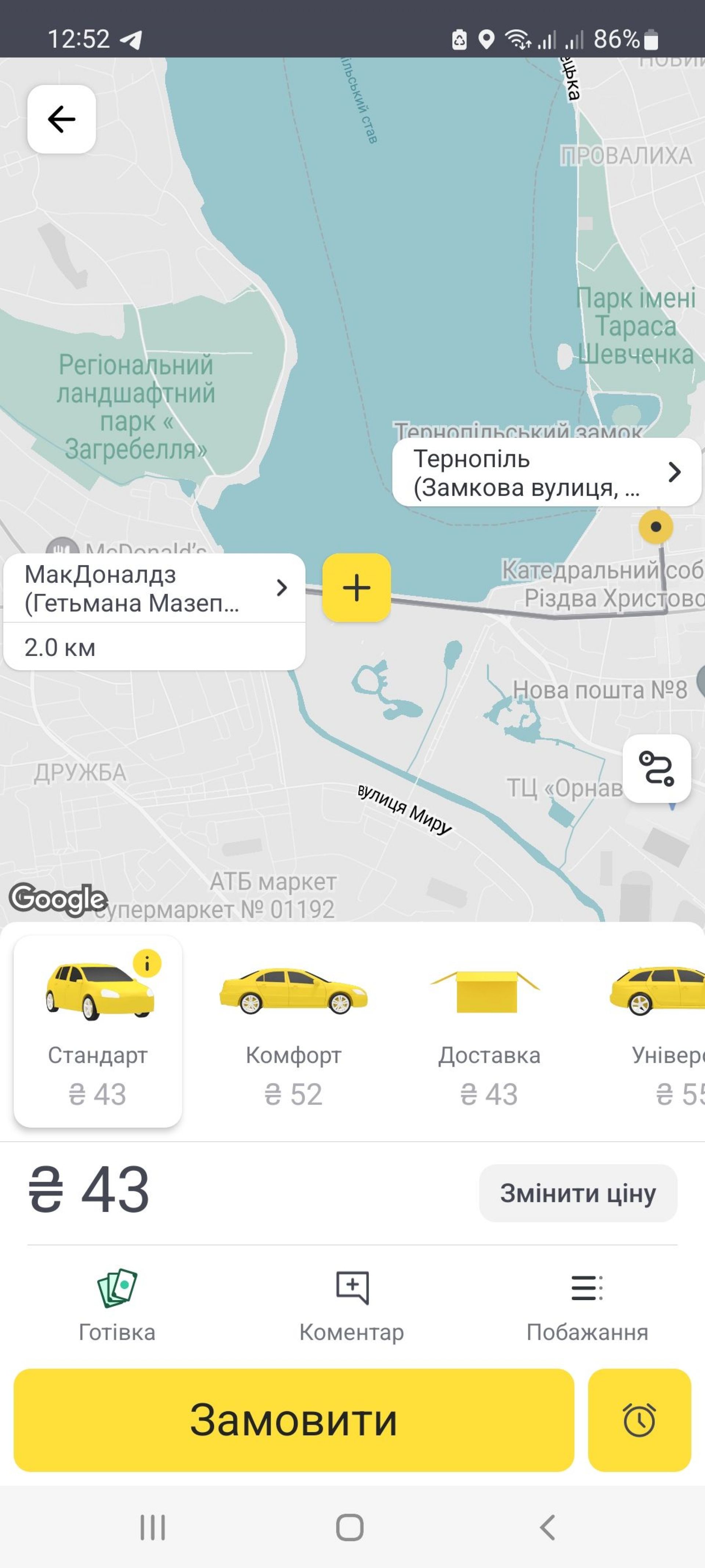 Тож, стандартна поїздка за нашим двокілометровим маршрутом від готелю Тернопіль до McDonalds коштуватиме 43 гривні.