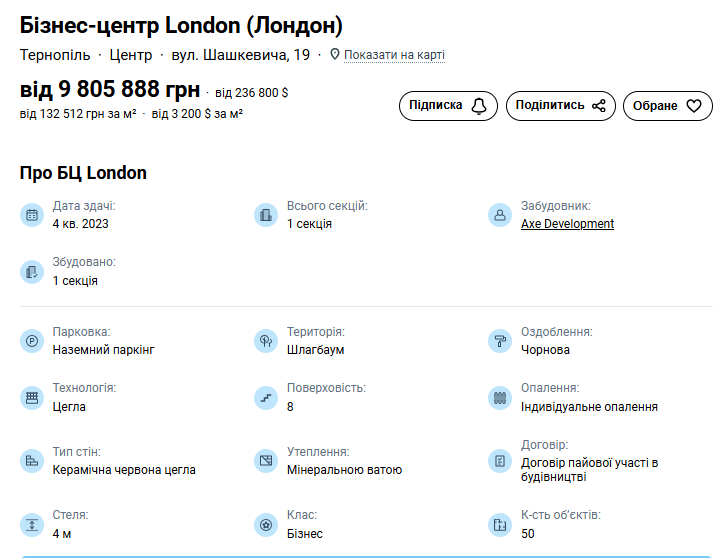 Щодо бізнес-центру «Лондон», на сайті нерухомості «Дім RIA» зазначено, що це восьмиповерхова будівля без підземного паркінгу. Вартість квадратного метра нерухомості, станом на 4 квітня, вказана — 3 200 доларів.