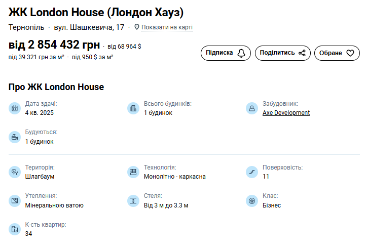 На вулиці Шашкевича, 17 розташований житловий комплекс London House. Дата здачі вказана — 4 квартал 2025 року. Кількість поверхів — 11, кількість квартир — 34. Вартість квадратного метра для одно-і двокімнатних квартир — від 1 090 доларів на метр квадратний. Багаторівневі — від 950 доларів. На сайті нерухомості «ЛУН» також вказано, що у житловому комплексі передбачений гостьовий паркінг, укриття немає.