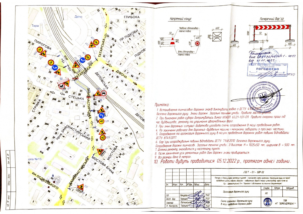 На період проведення робіт будуть встановлені відповідні дорожні знаки згідно з схемою організації дорожнього руху.