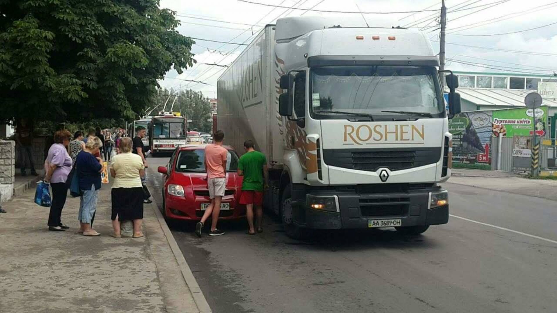На Збаразькій водій фури Roshen затиснув авто Toyota