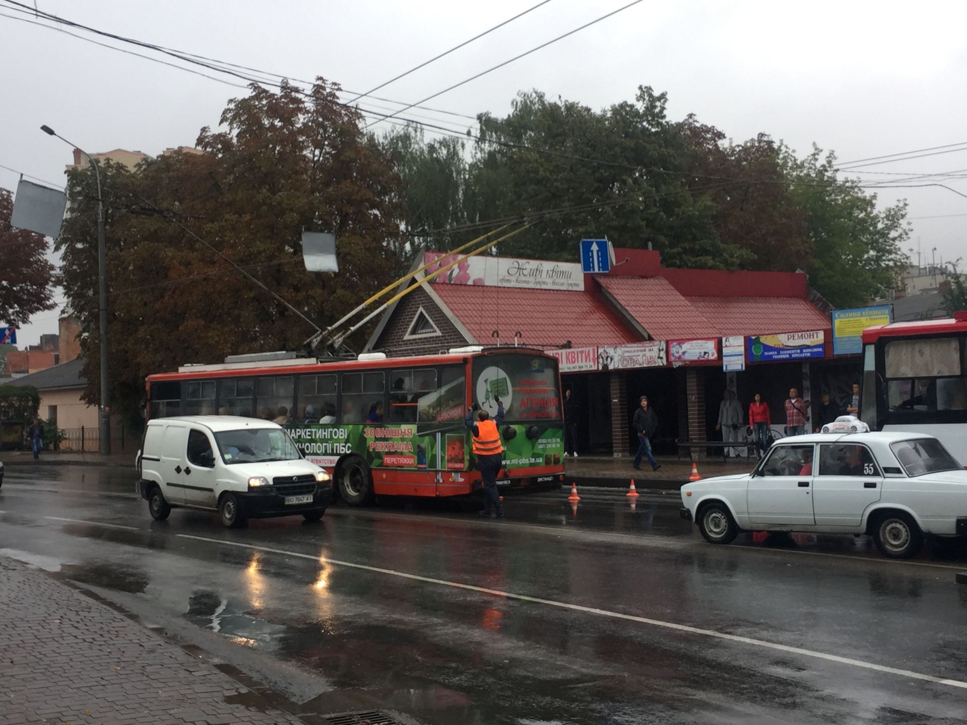 В тролейбуса обірвались електродроти, його водій допомагає об"їхати іншим тролейбусам.
