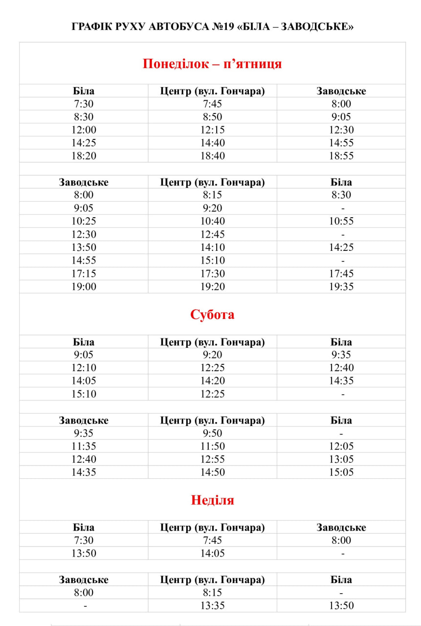 З 16 березня функціонує новий автобусний маршрут №19 «Біла – Заводське».