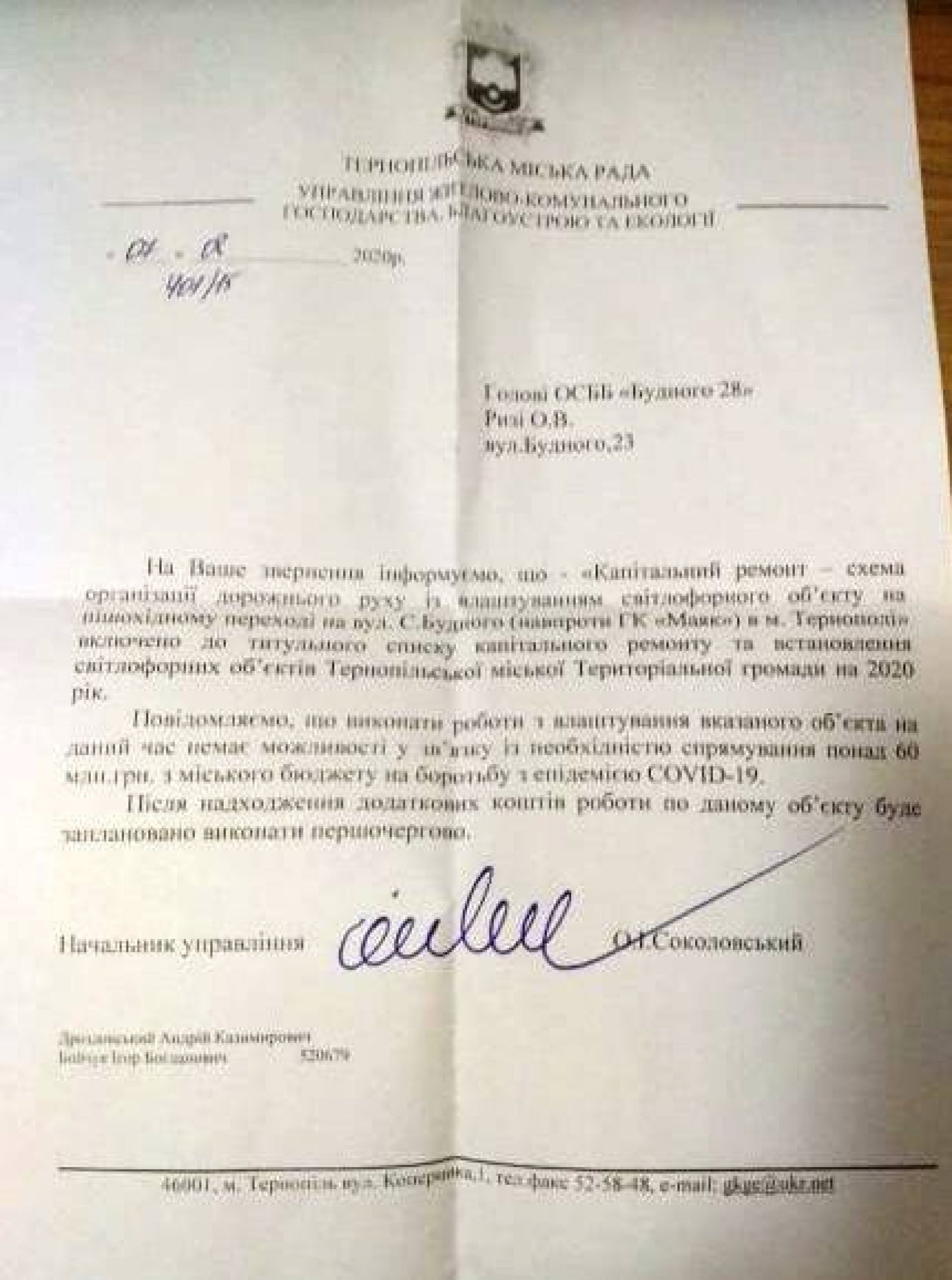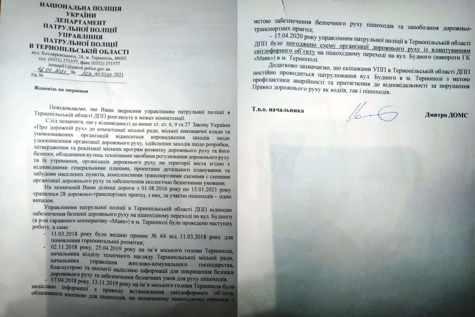 У квітні 2020 р. мешканцям надійшла відповідь від управління патрульної поліції в області, що «було погоджено схему організації дорожнього руху із влаштуванням світлофорного об'єкта на пішохідному переході на вул. С. Будного м. Тернопіль». У липні прийшла відповідь і від міськради, що, мовляв, почули., і цей об’єкт вже є у титульному списку. Однак закінчився 2020 р., почався 2021-ий, а світлофора як не було, так і немає.