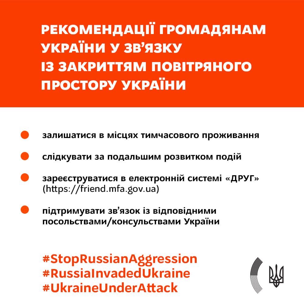 Українцям рекомендують зареєструватися в електронній системі "ДРУГ" і підтримувати зв'язок з посольствами або консульствами України для подальших інструкцій.