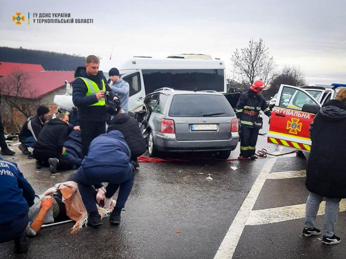 За словами речника поліції Тернопільщини Сергія Крети, постраждалих в цій ДТП більше — орієнтовно 7-8 чоловік. Найтяжчі травми отримали водій і пасажир Volkswagen Passat. Чимало людей звертаються за меддопомогою і отримують її на місці. Декого вже повезли до лікарні. Тому вказати точну кількість постраждалих наразі неможливо.