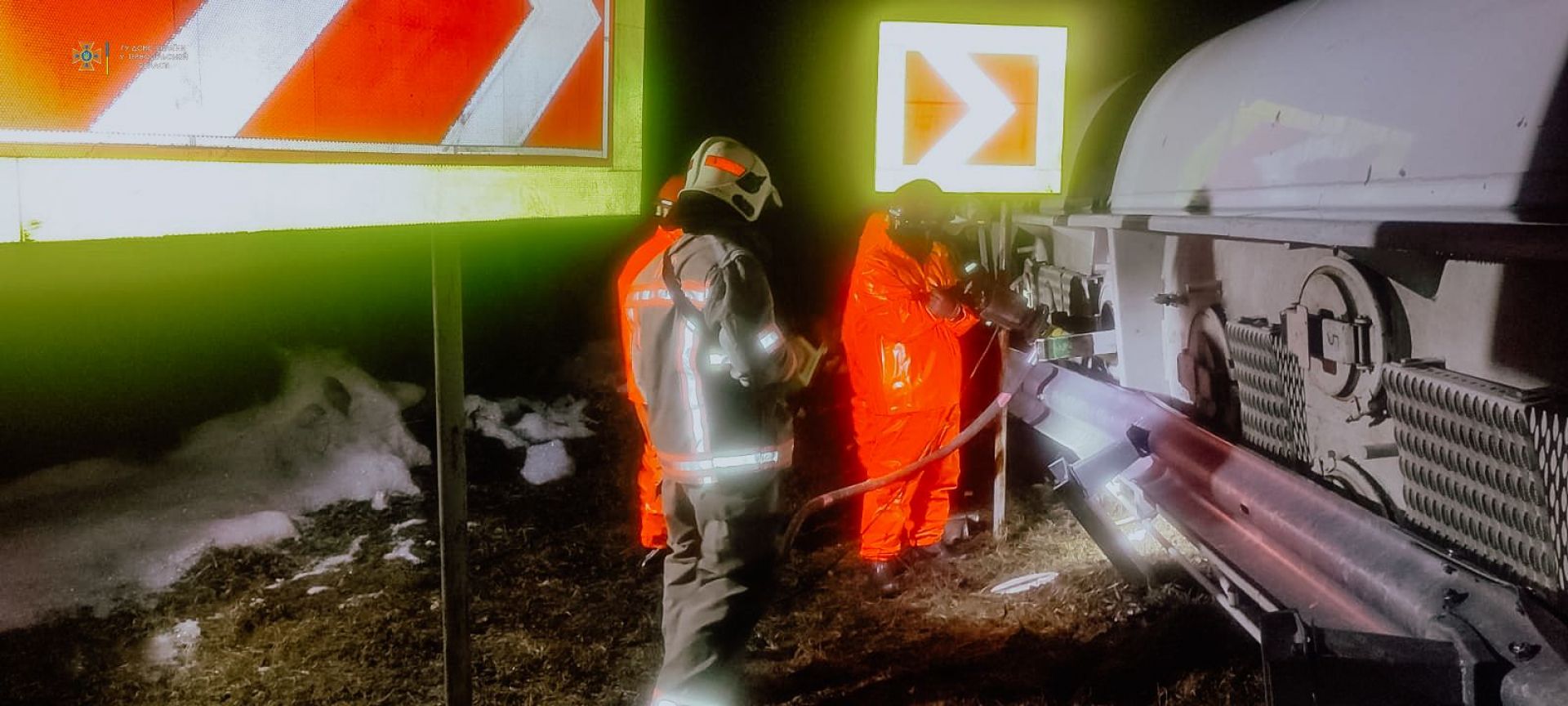 - Цистерна розгерметизувалась, пальне вилилось на узбіччя дороги. Аби не виникла пожежа та не вибухнуло, рятувальники створили пінну подушку та виконали обвалування з піску для обмеження розтікання пального.