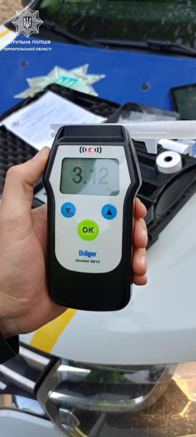 З перших хвилин спілкування у керманича ми виявили ознаки алкогольного спʼяніння. Огляд на визначення стану спʼяніння чоловік погодився пройти на місці зупинки за допомогою алкотесту Драгер. Результат позитивний — 3,12 проміле.