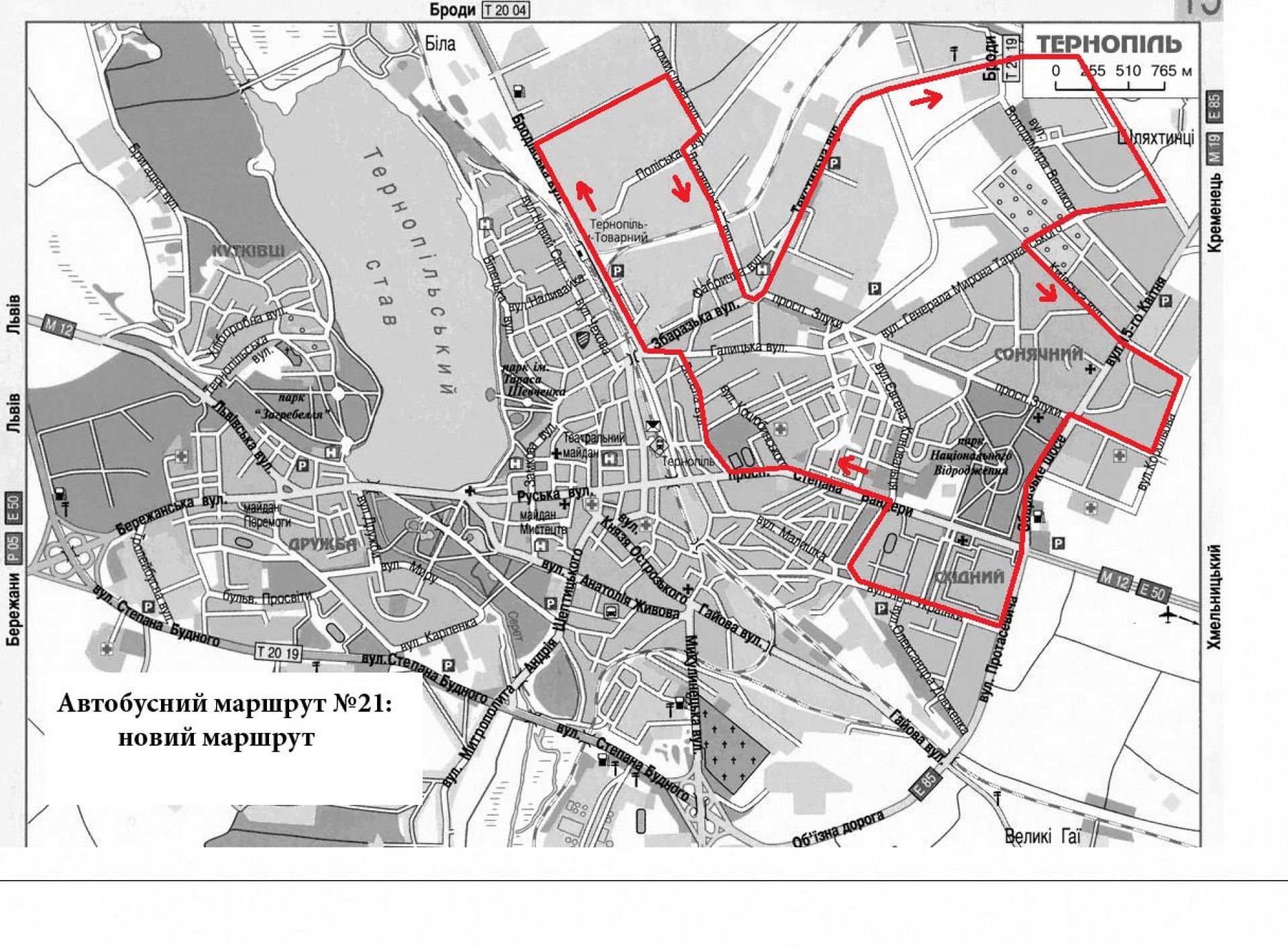 Також, пропонується запровадити новий автобусний маршрут №21 «Вул. Лесі України – ТРЦ «Подоляни», що забезпечить сполучення масиву «Східний» з вул. Бродівською, адже на даний момент такого сполучення у місті немає, далі через вул. Промислову, гіпермаркет «Епіцентр», вул. Текстильну до ТРЦ «Подоляни» та через вул. Київську, В. Стуса до лікарні №2. Важливо, що за рахунок цього усі лікарняні заклади, які розміщені на вул. Р. Купчинського, відтепер матимуть транспортне сполучення в обидві сторони з вул. Київською та вул. В. Симоменка. Окрім того, пропонується, щоб автобуси, які обслуговуватимуть даний маршрут, від просп. Степана Бандери курсували через вулиці Шухевича і Веселу, де неподалік знаходиться управління соціальної політики, до вул. Бродівської.