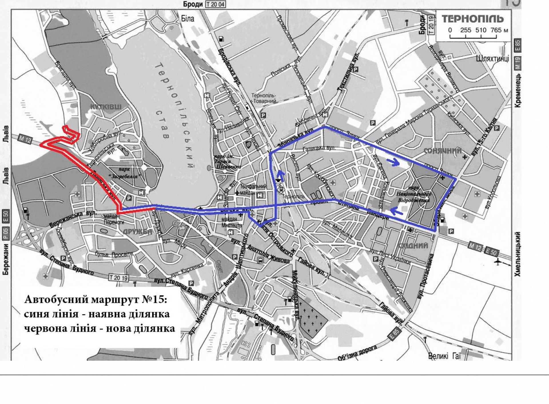 Маршрут №15 «Вул. Золотогірська – просп. Злуки – просп. Степана Бандери». Для покращення транспортного сполучення мешканців вул. Золотогірської і Бенцаля з залізничним вокзалом та просп. Злуки, а також уникнення дублювання маршрутів у районі вул. Кривоноса та Миру, пропонується приєднати маршрут №25 до маршруту №15.