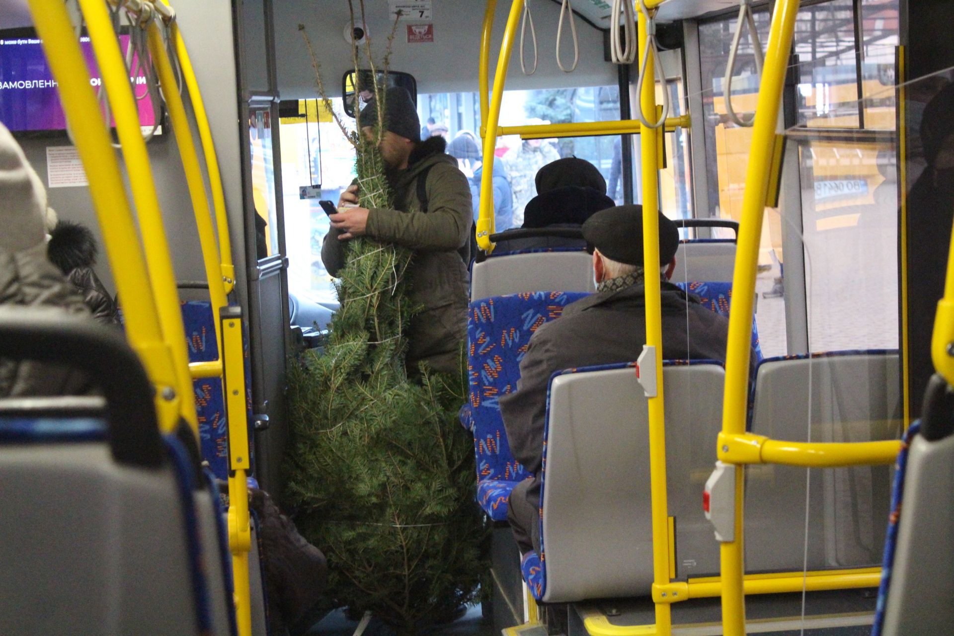 На зупинці «Центральний ринок» та «Автовокзал» багато людей заходить з незвичним багажем до автобусів. Напередодні свят багато тернополян везуть додому живі ялинки з ринку.