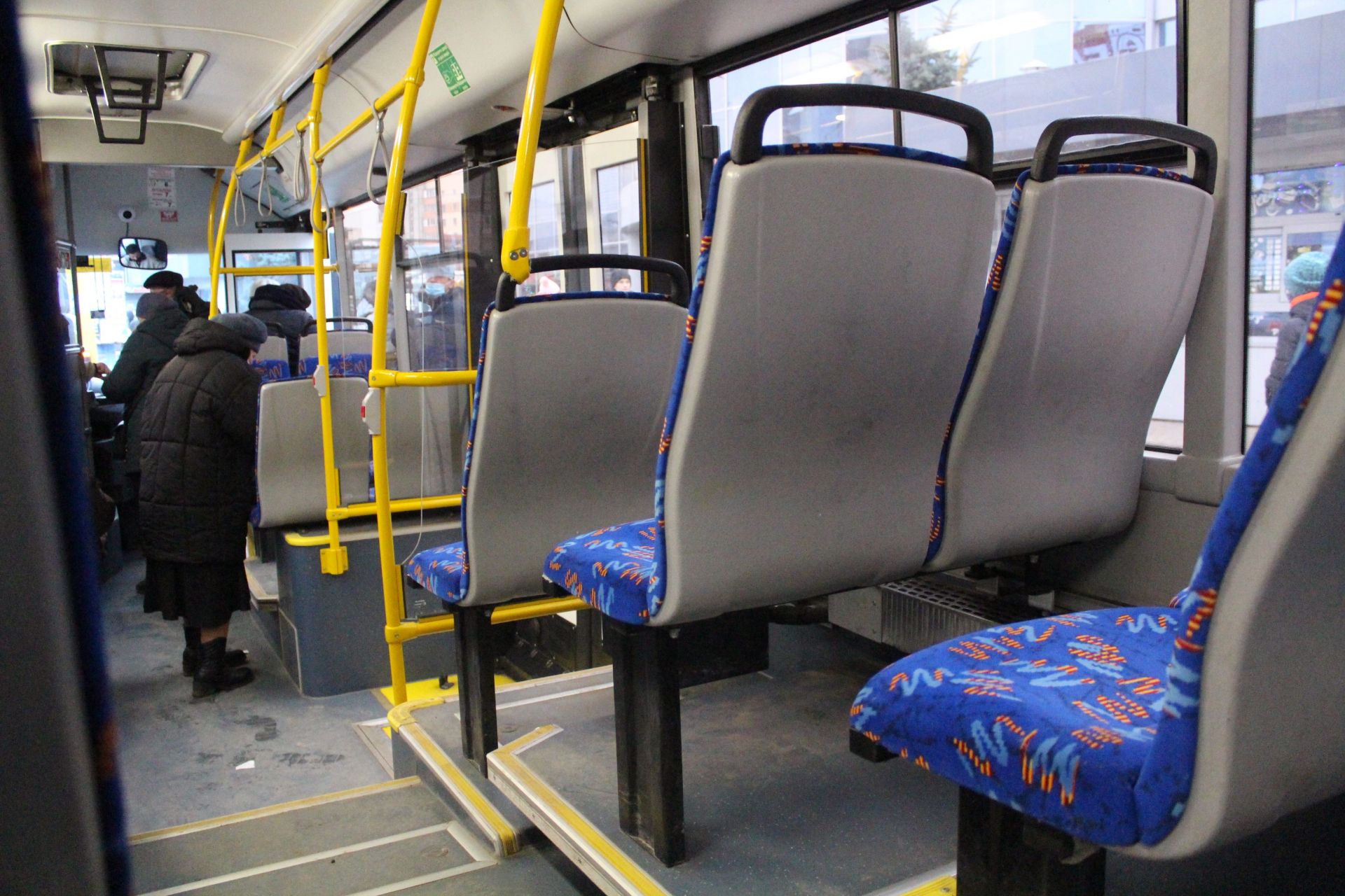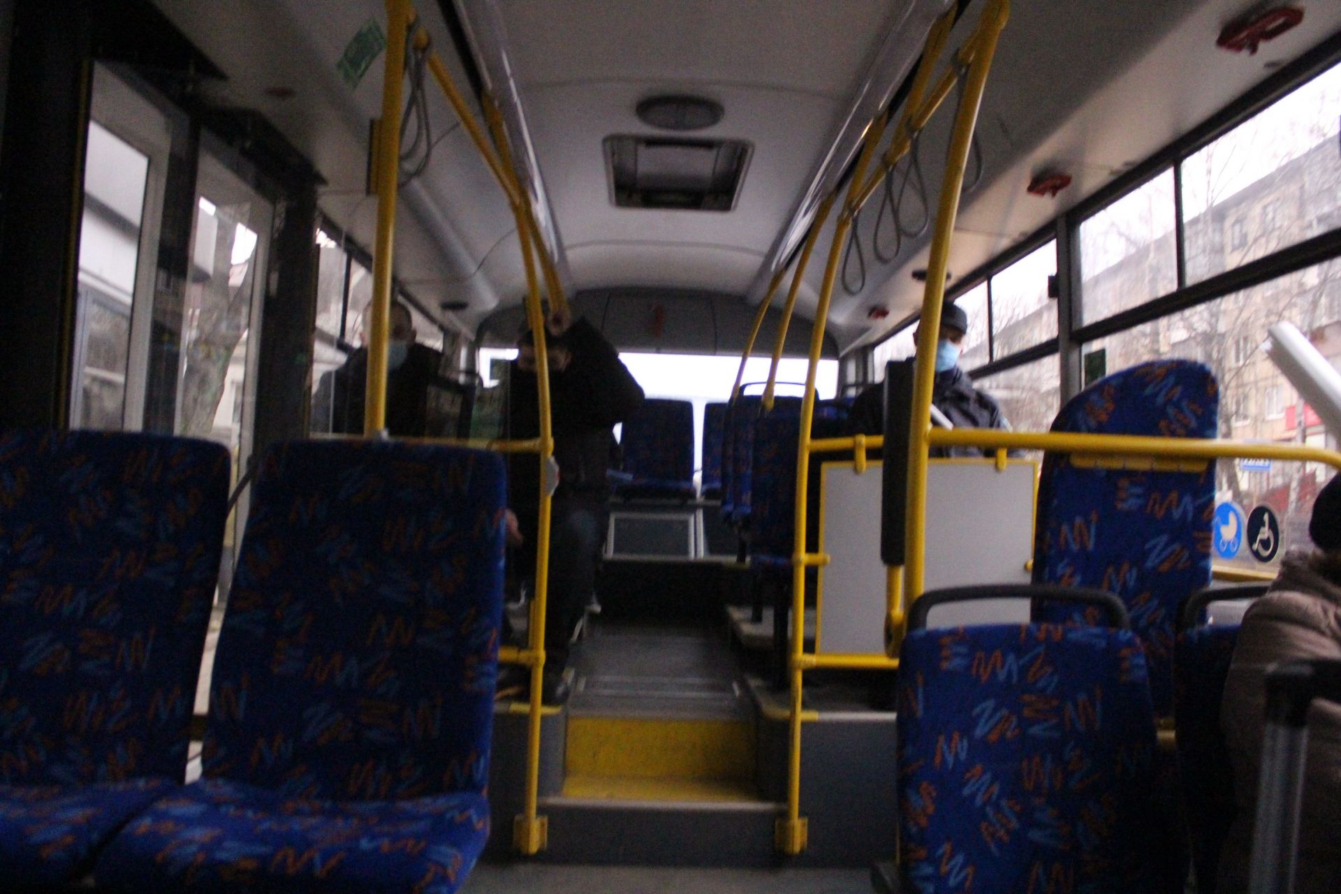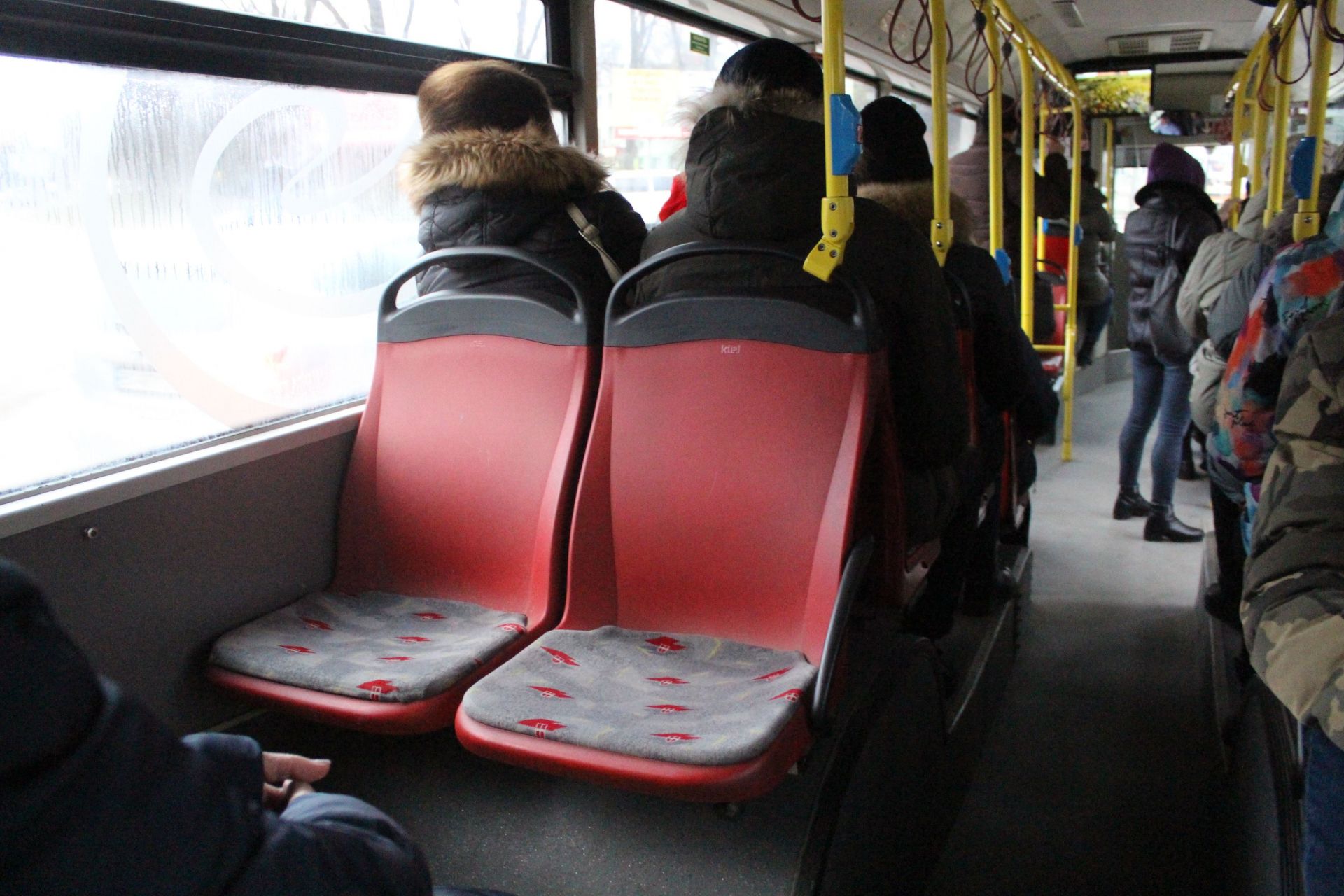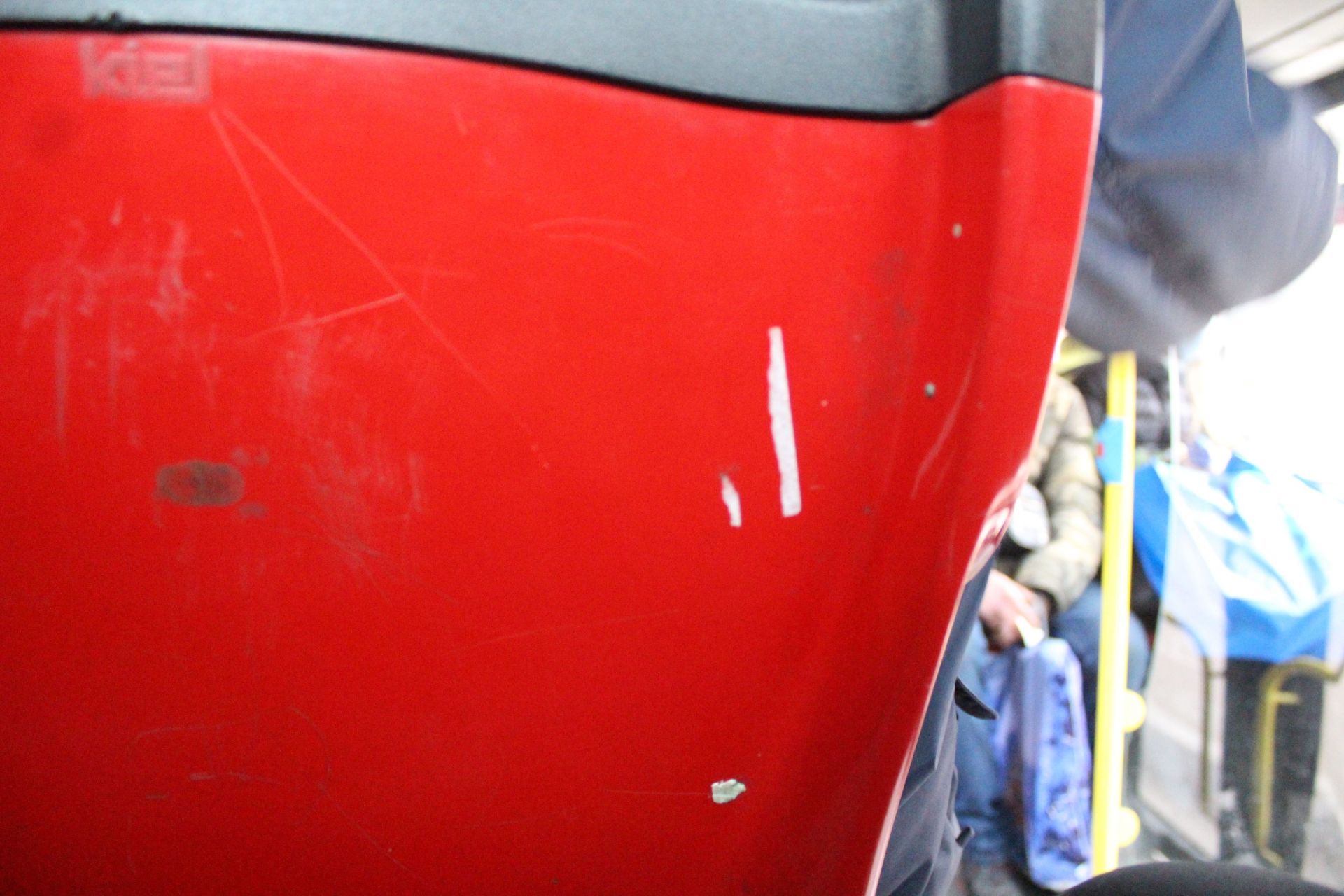 Всередині він виглядає як новий, однак якщо почати вдивлятися – стає помітно не дуже приємні речі. Деякі пасажири нищать транспорт. Сидіння пластикові. На спинках є подряпини, написи на залишки наклейок.