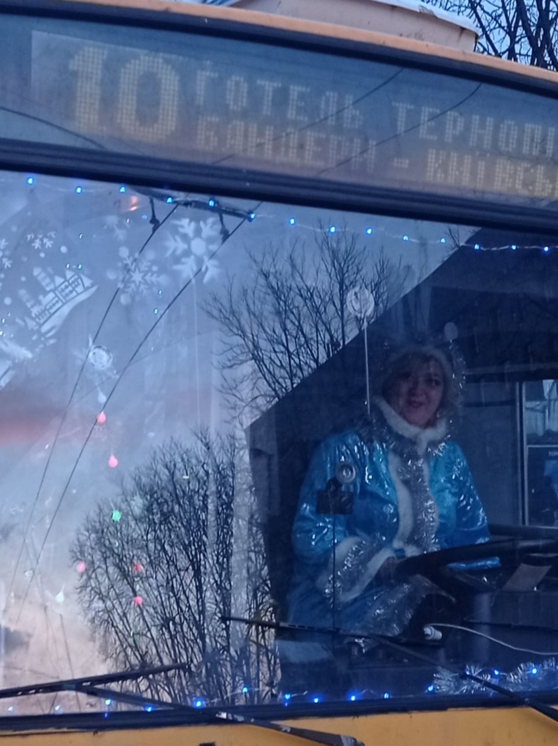За кермом — Снігурка, у салоні — Дід Мороз. Тернополян потішив новорічний тролейбус (ФОТО ДНЯ)
