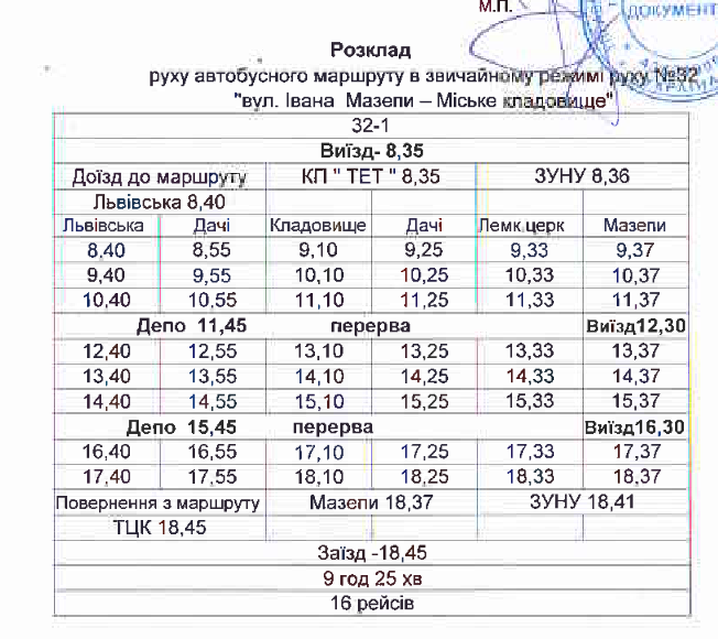 З 5 червня та на весь літній період внесли зміни у розклад руху автобусного маршруту №32 «вул. Івана Мазепи – Міське кладовище».