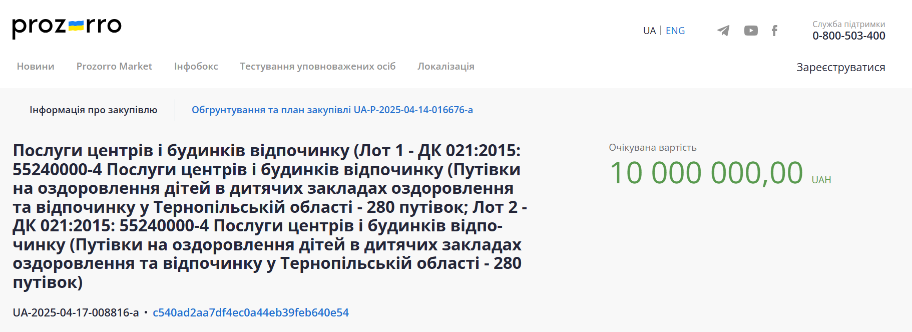 Журналісти «20 хвилин» промоніторили портал закупівель Prozorro. За 2025 рік там є одна закупівля від департаменту соціального захисту населення щодо оздоровлення дітей на суму 10 млн грн. Закупівлю оприлюднили 17 квітня, а вже 14 травня підписали договори.