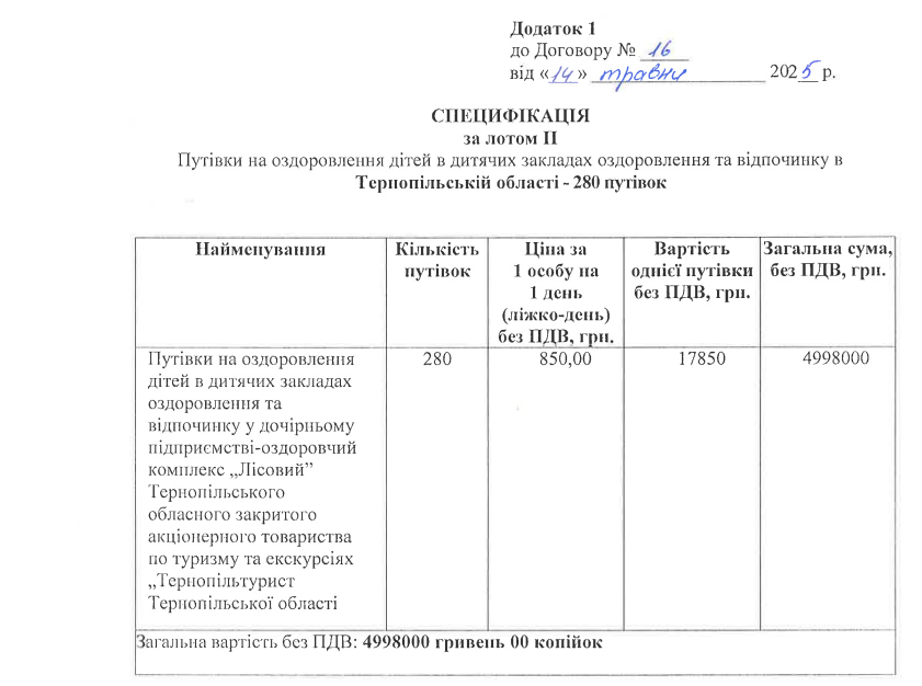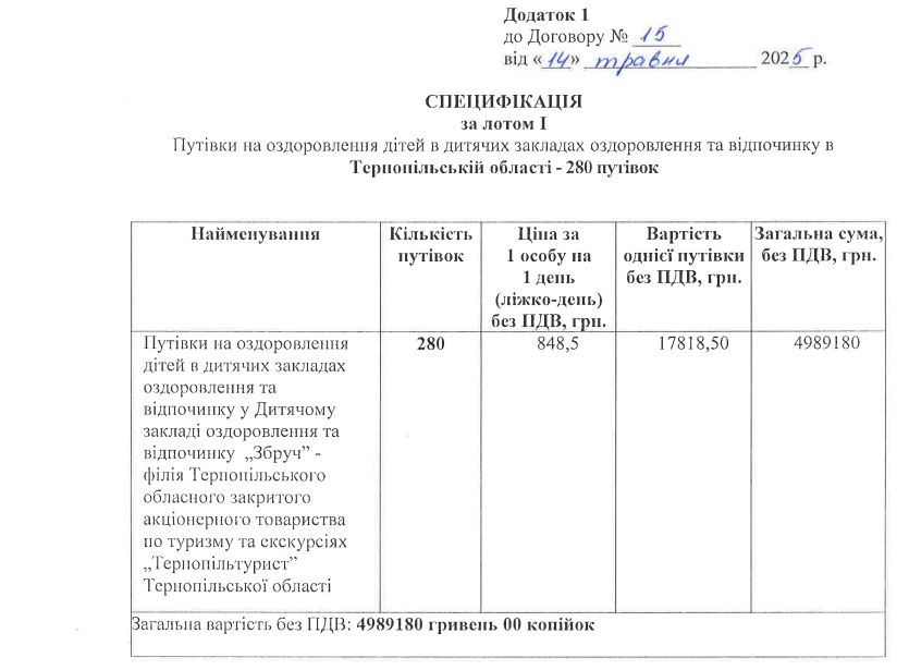 Згідно з тендерною документацією, 280 путівок закупили в оздоровчому комплексі «Лісовий» за 4 998 000 грн, ще 280 – у таборі «Збруч» на суму 4 989 180 грн. Скріни-підтвердження публікуємо нижче.