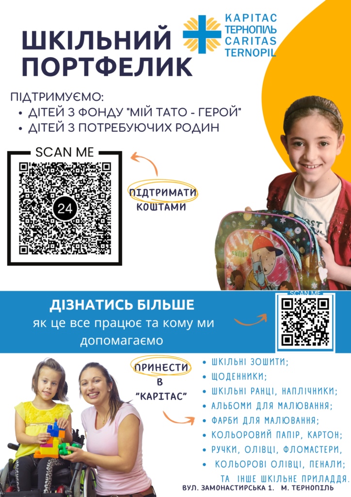 Допомогти підготуватися діткам до школи може кожен! Для цього до 28 серпня у «Карітас Тернопіль» (вулиця Замонастирська, 1) можна принести: