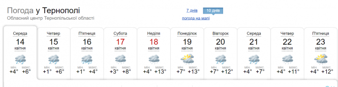 Ольга Похиляк каже, що за прогнозами з понеділка, 19 квітня, температура має підвищуватись. Заходимо на сайт Синоптика і бачимо, що потепління незначне.