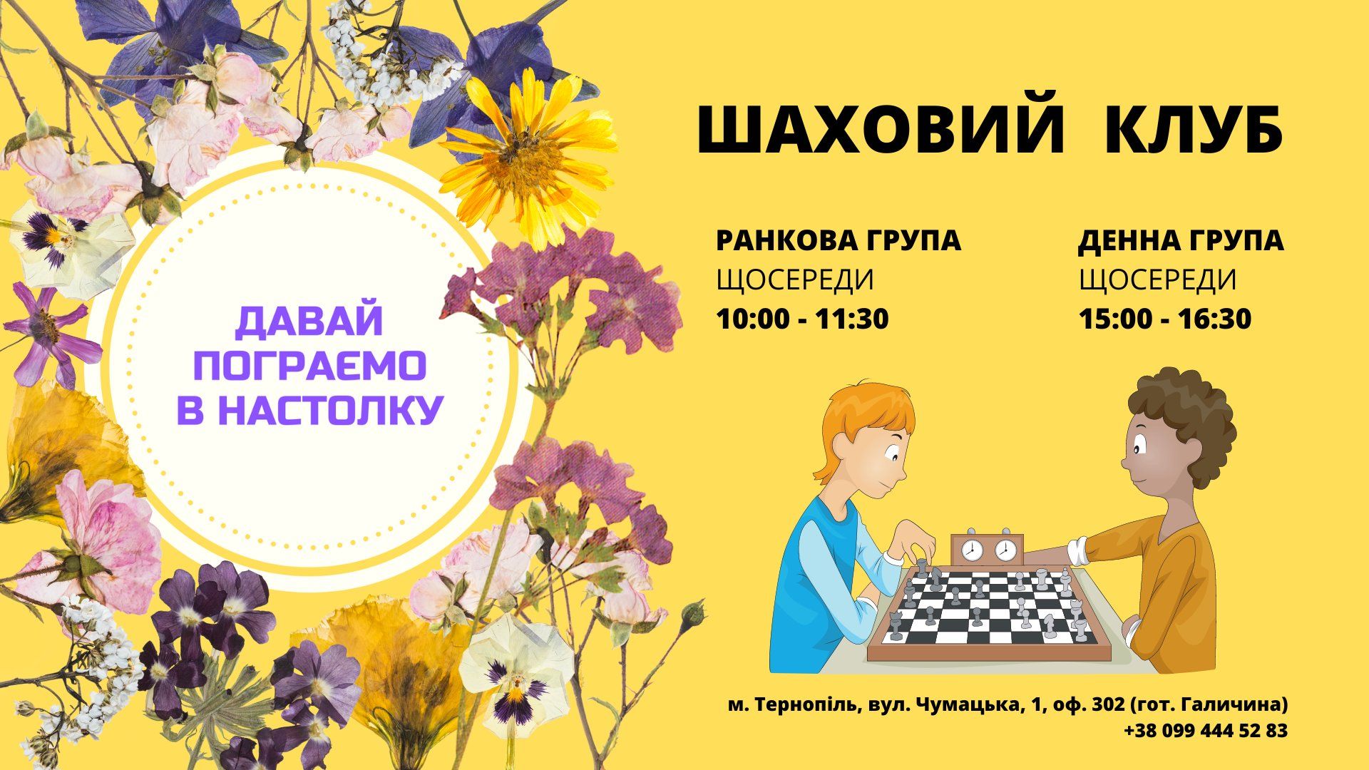 У середу, другого листопада, клуб інтелектуального відпочинку «Давай разом» запрошує тернопільських школярів долучитися до шахового клубу. Шахи – чудовий спосіб для тих, хто хоче потренувати свої розумові здібності, мати розвинену логіку та відмінну пам’ять. Ведучий тренер клубу – Богдан Мазурчак, кандидат у майстри спорту, український рейтинг 2413, міжнародний рейтинг 2250.