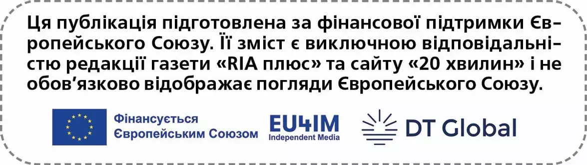 - Ця публікація підготовлена за фінансової підтримки Європейського Союзу. Її зміст є виключною відповідальністю редакції газети «RIA плюс» та сайту «20 хвилин» і не обов’язково відображає погляди Європейського Союзу.