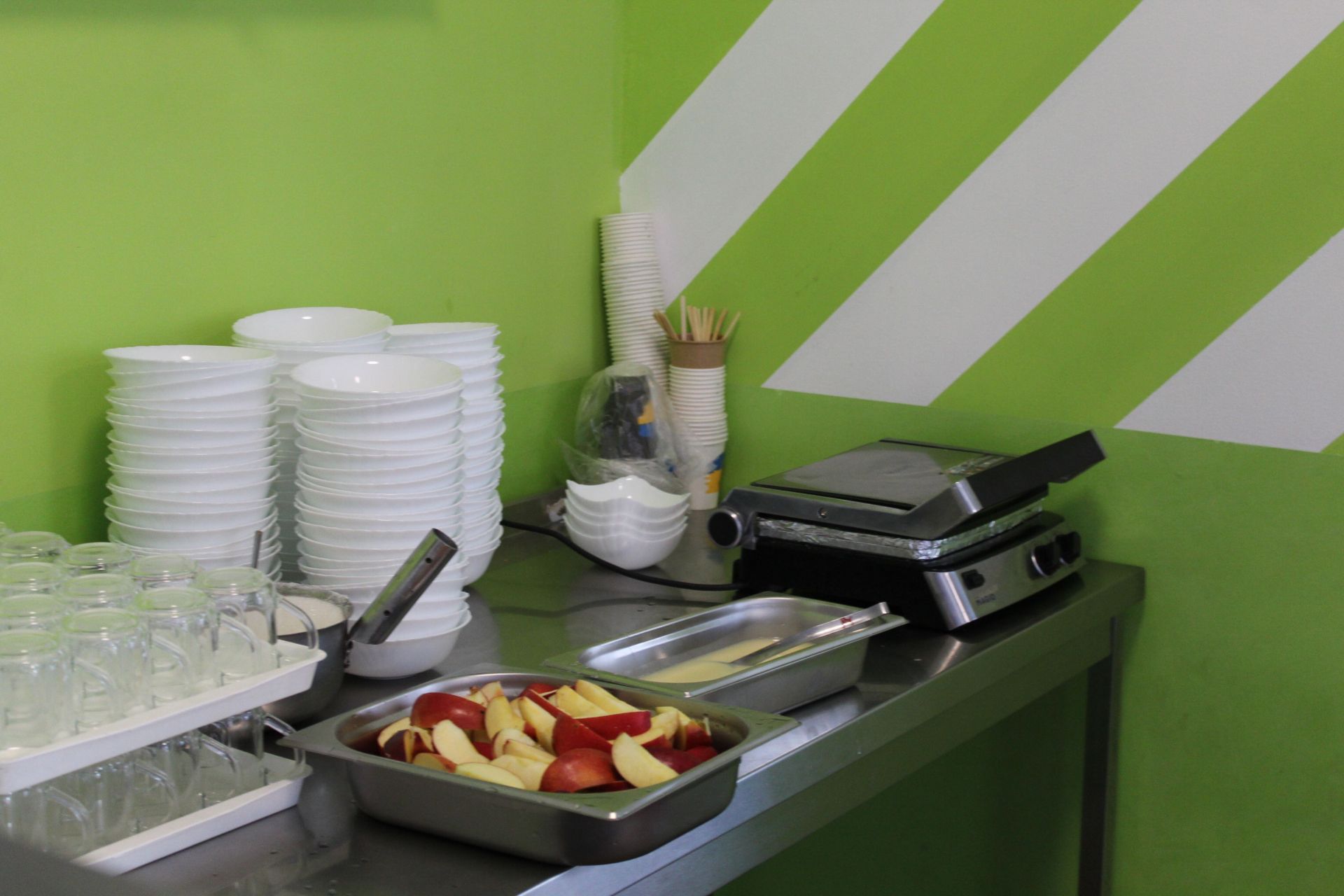 Наприклад, пояснює вона, аби діти на сніданок їли теплі оладки, посмажити їх треба вранці, так підлаштуватись, аби було світло. З картоплею такий же нюанс. Тому на кухні можуть міняти місцями «дні» в меню. Також мають буфет, де малеча приходить і купує собі щось смачненьке. Зараз тут дещо порожньо, бо постачальники привозять булочки, печиво, воду й сік пізніше (ми були у школі о 8:30).